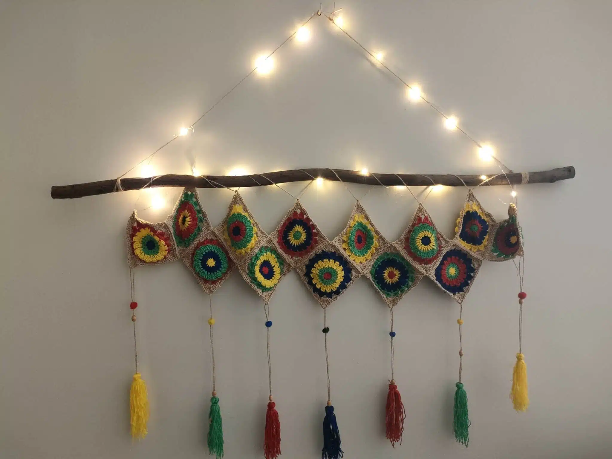 Natural Wood Branch with Granny Squares Crochet with battery operated B-lights