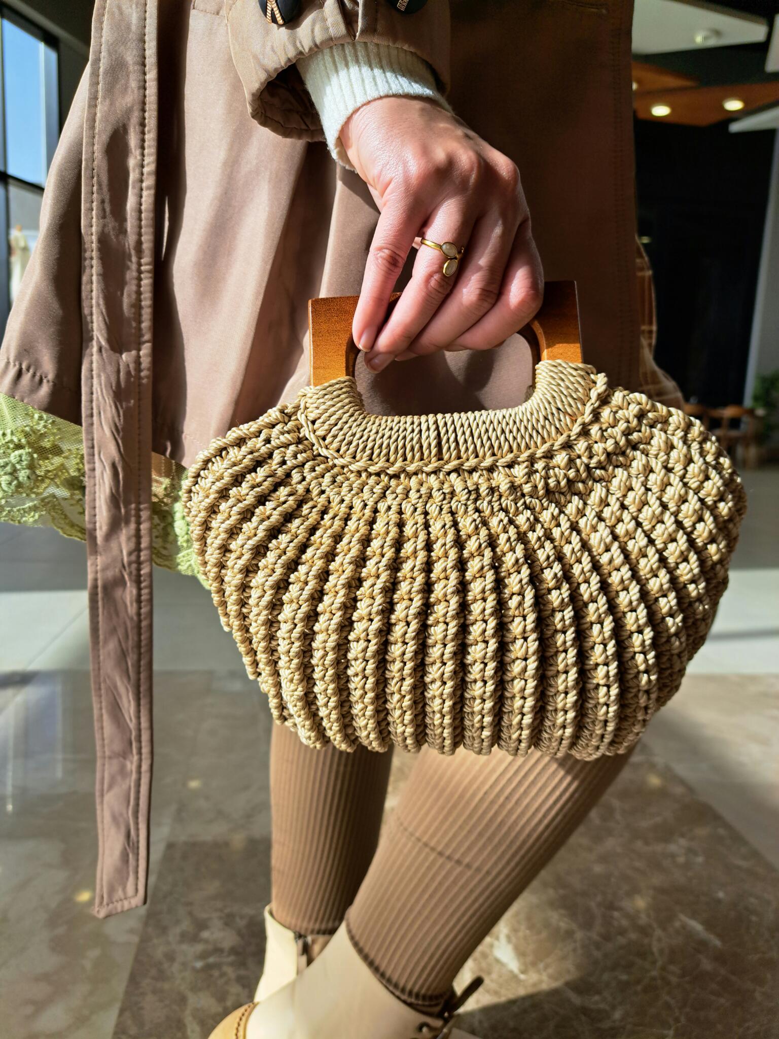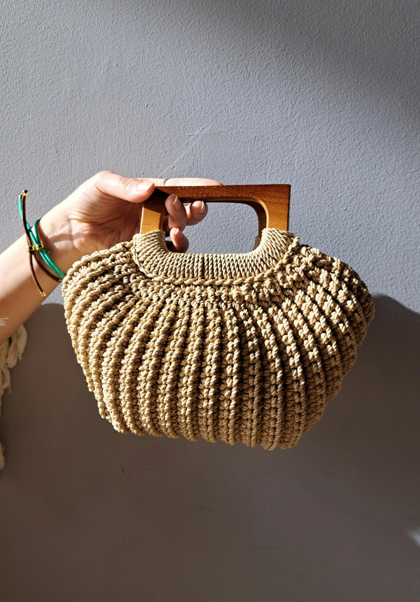 Handmade macrame yarn bag with wooden hand.