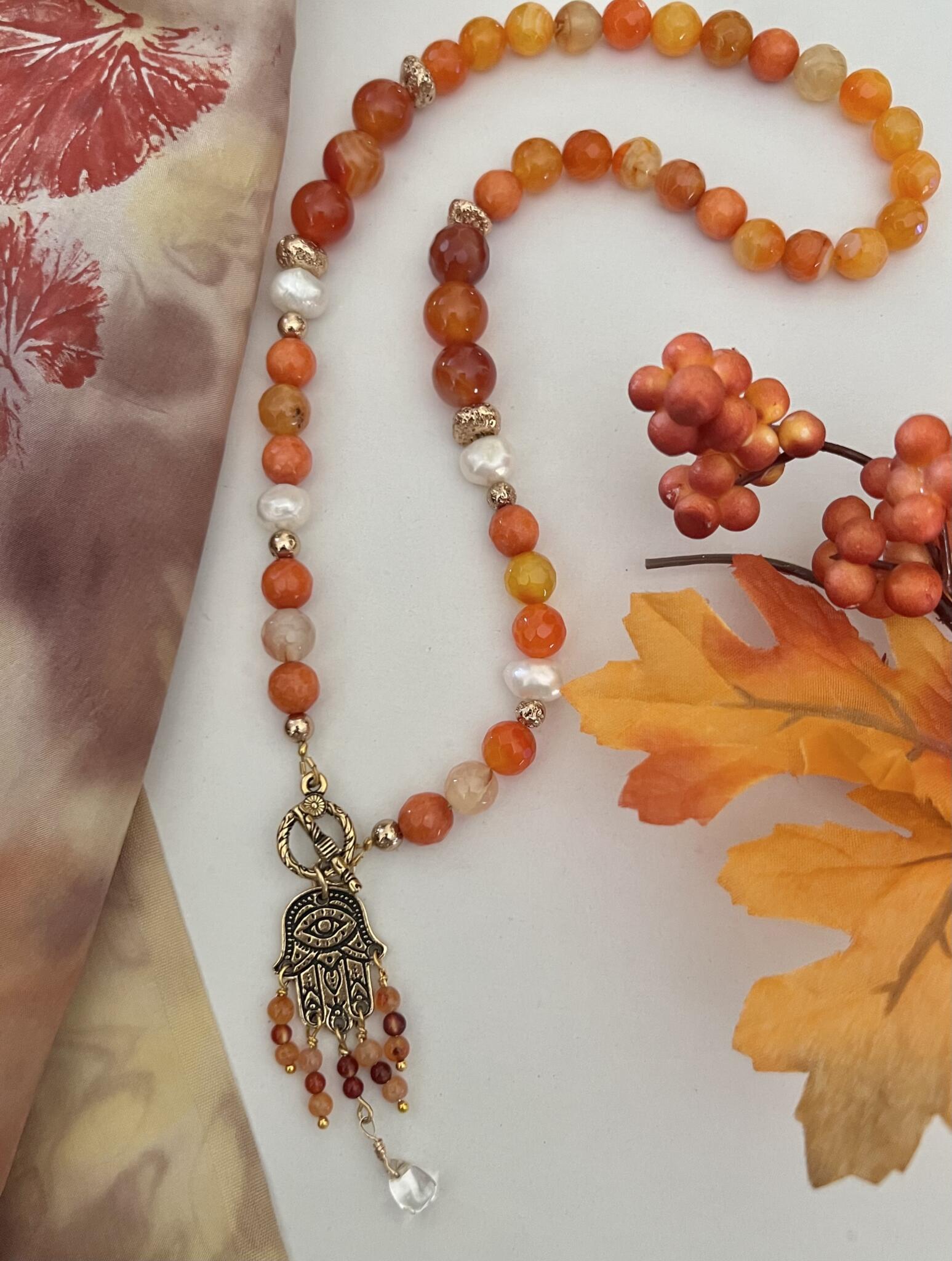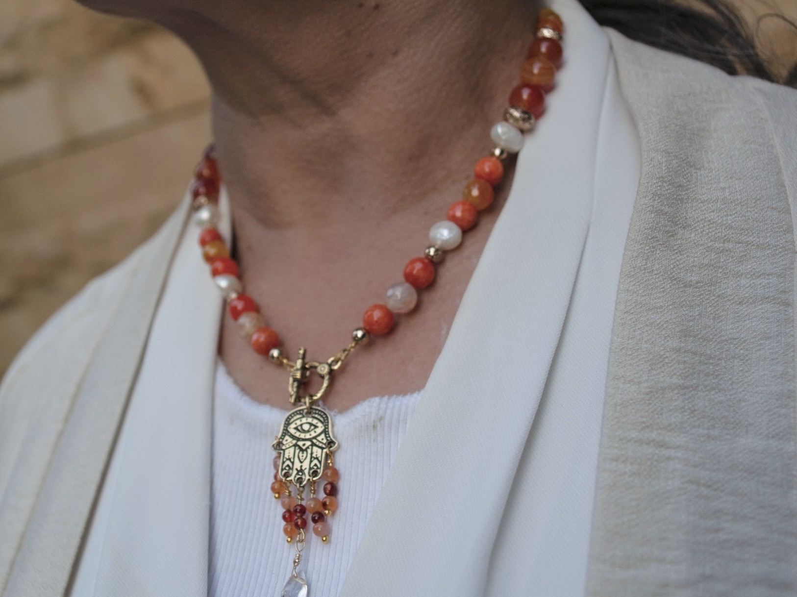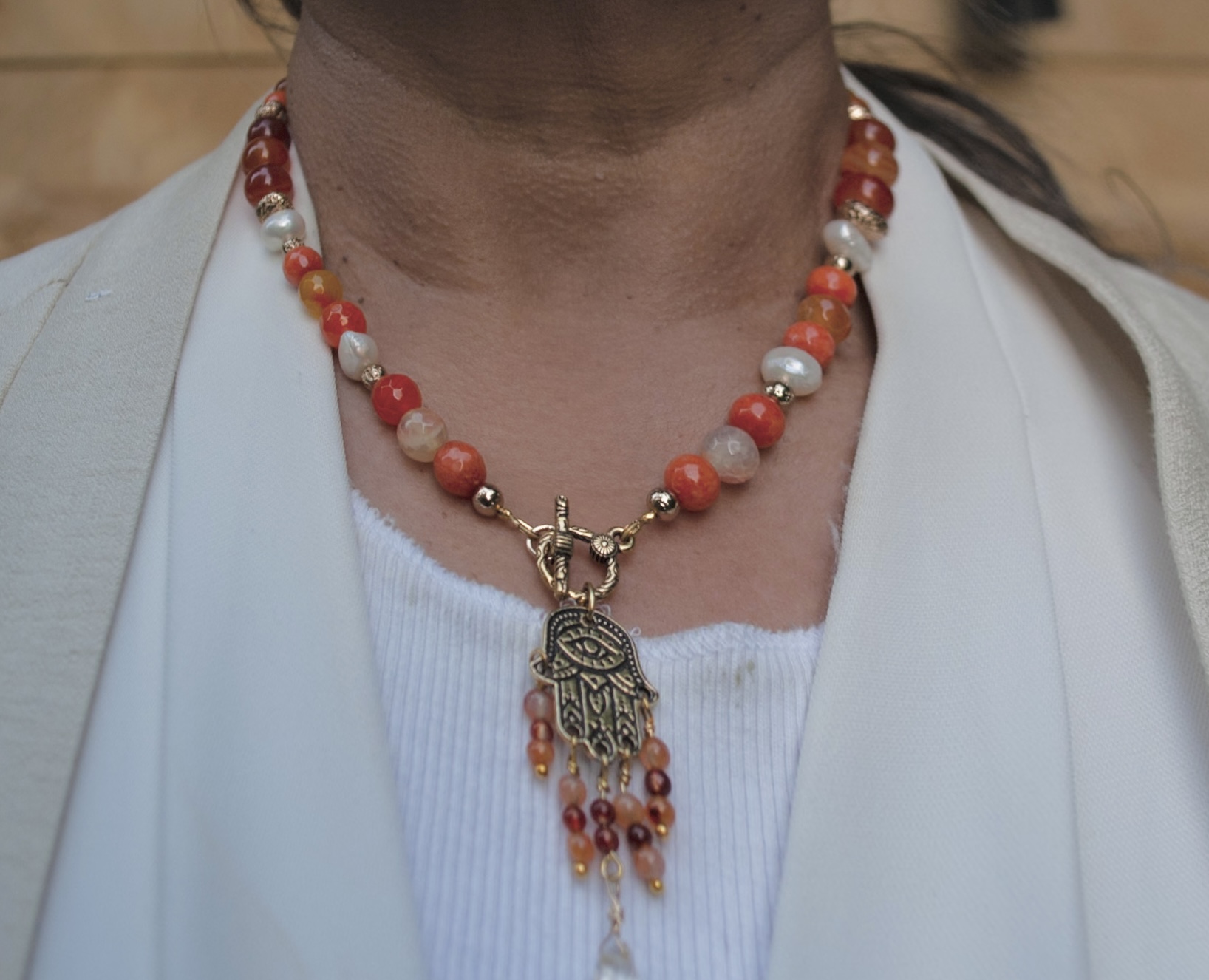 Bohemian, chic handmade necklace, made of 8mm Carnelian beads, 10mm Agate beads, freshwater cultured pearls, gold lava beads.