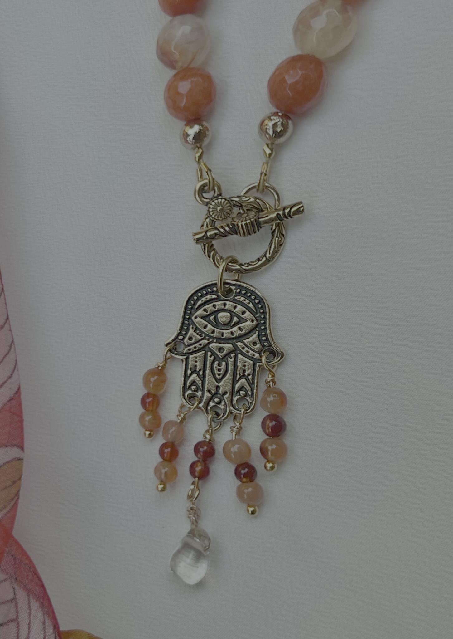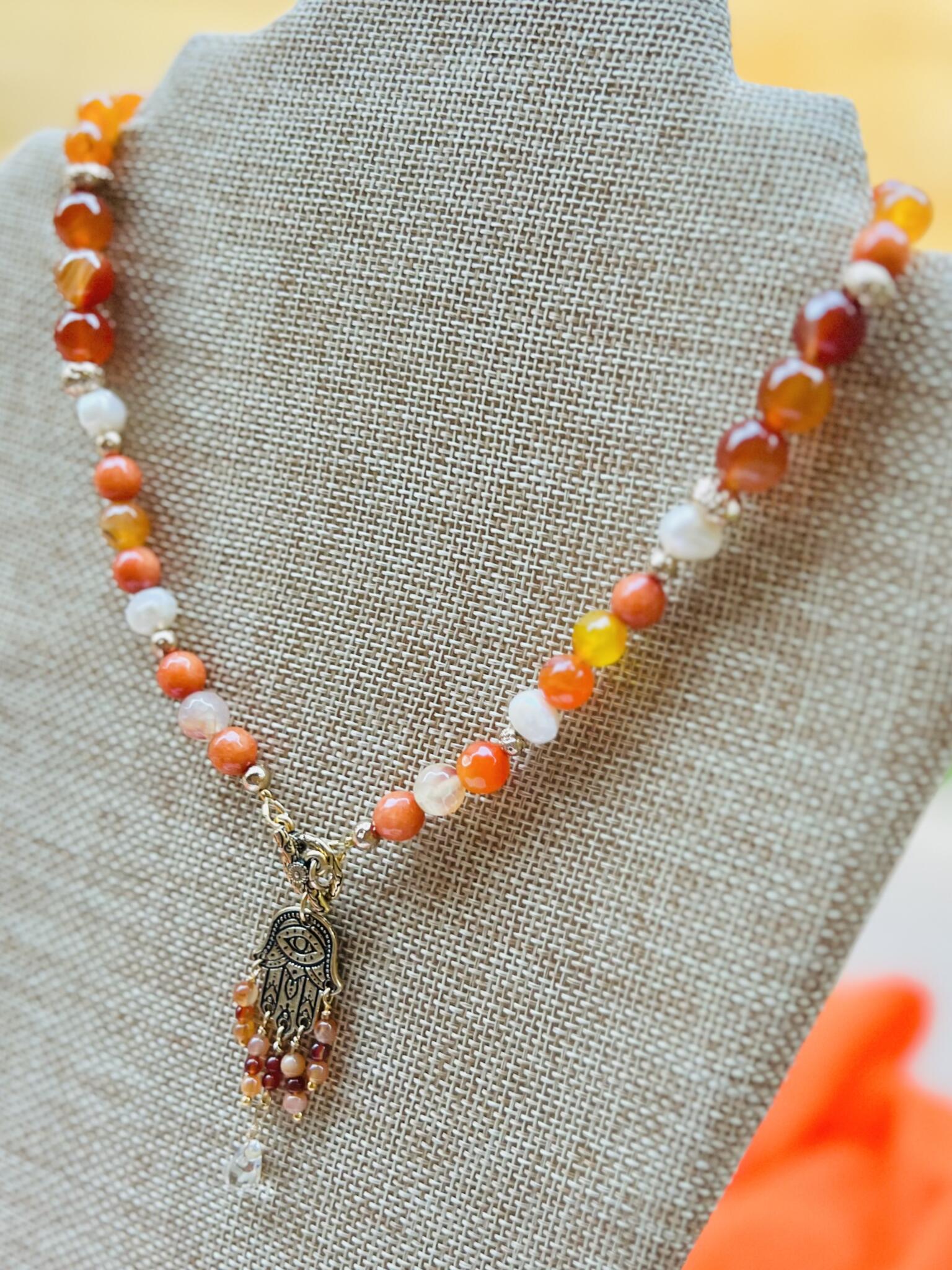 Antique gold plated hamsa hand adorned with dangling orange & radish brown agate & clear crystal drop.