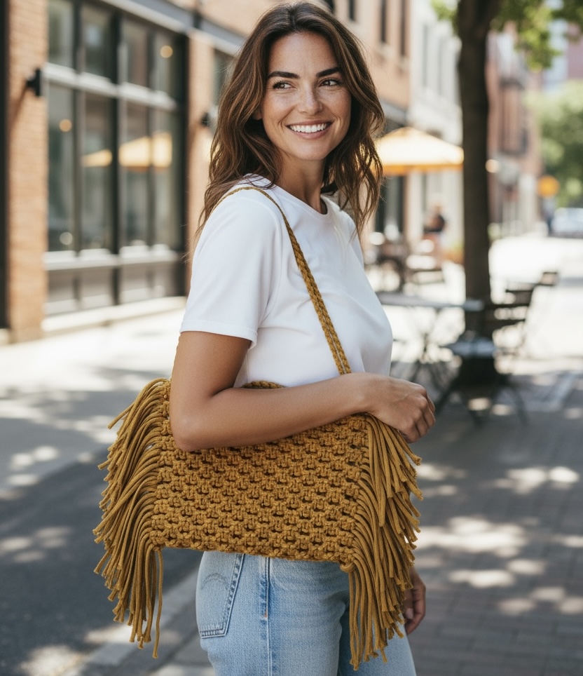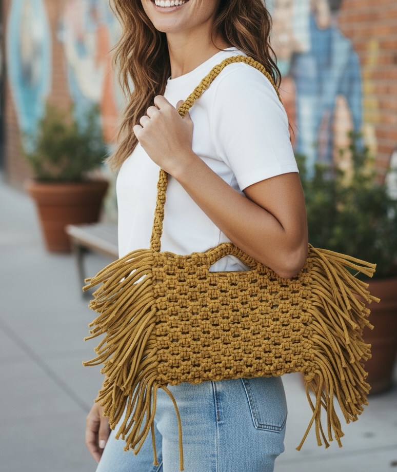 - Your signature macramé bag—custom color, luxe texture, all-day chic.