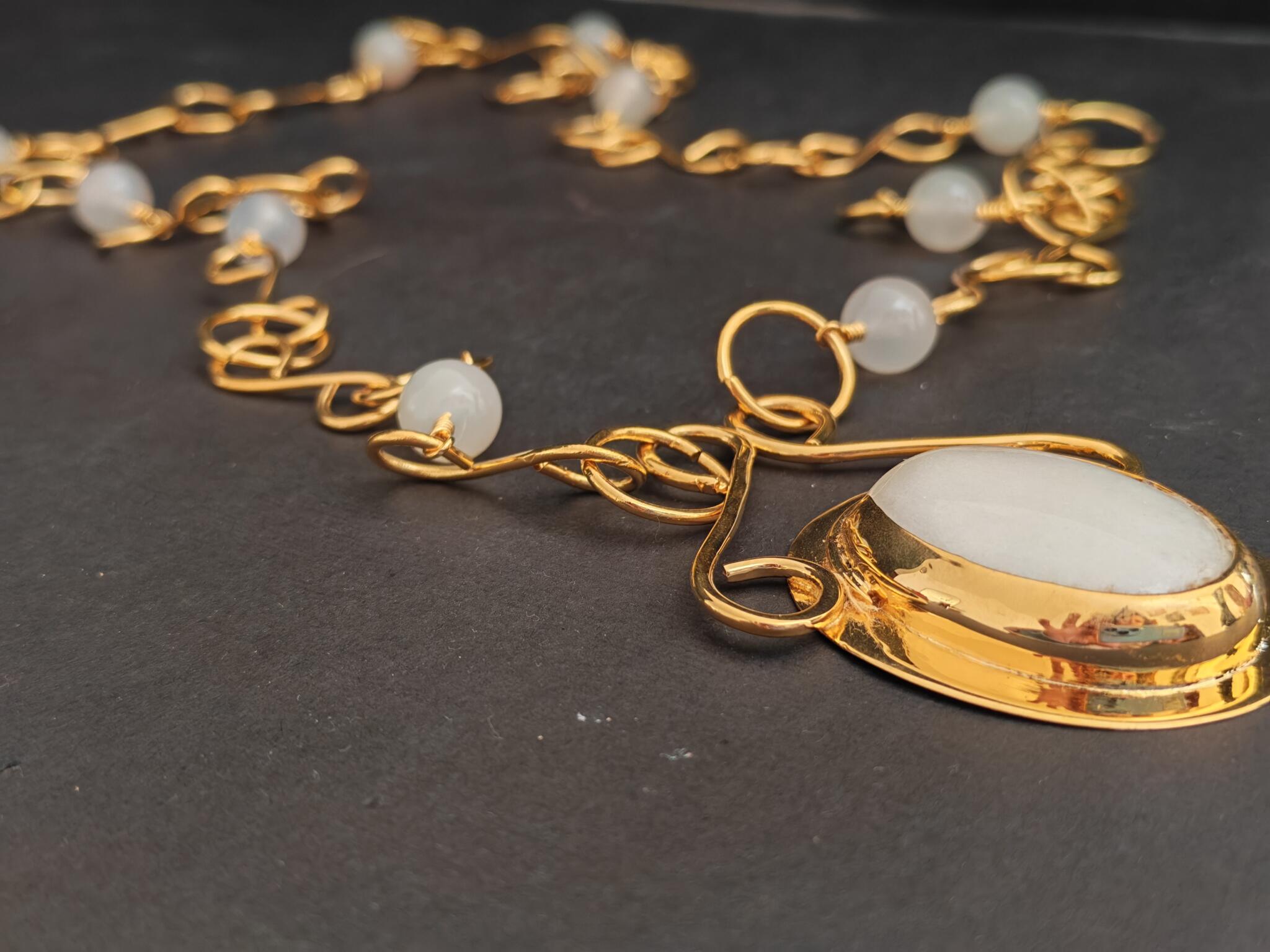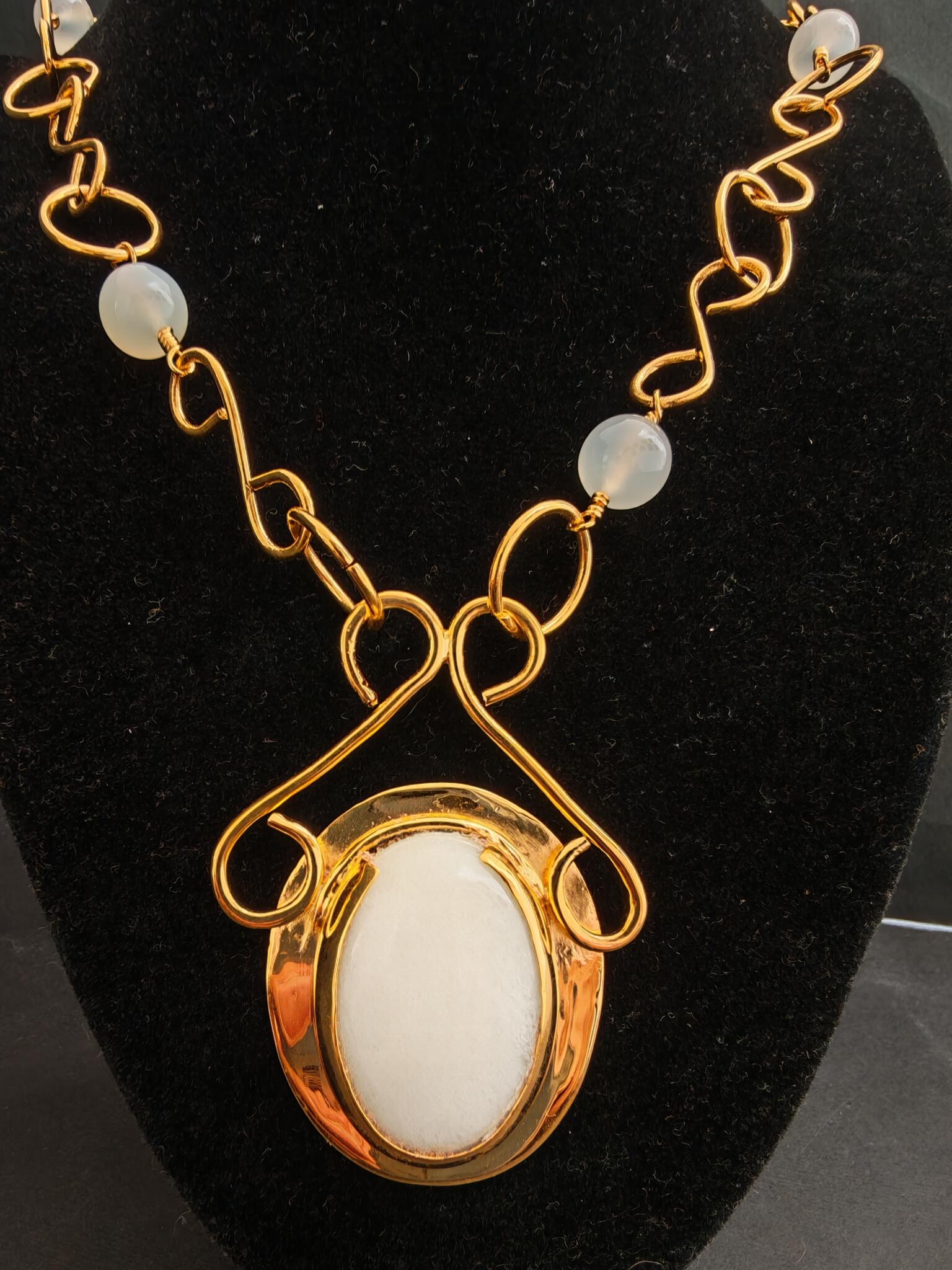 Long gold plated necklace with big white agate stone and small spherical agate stones.