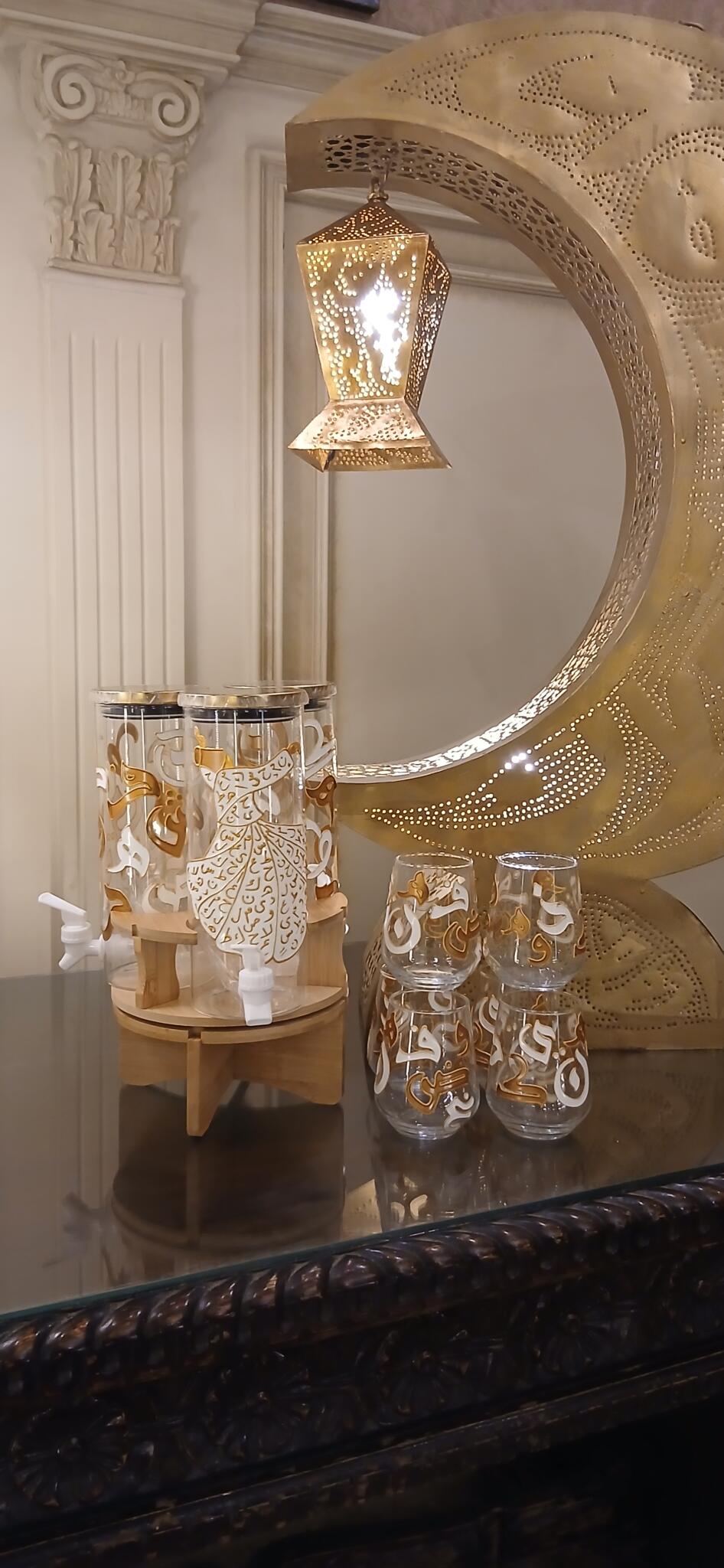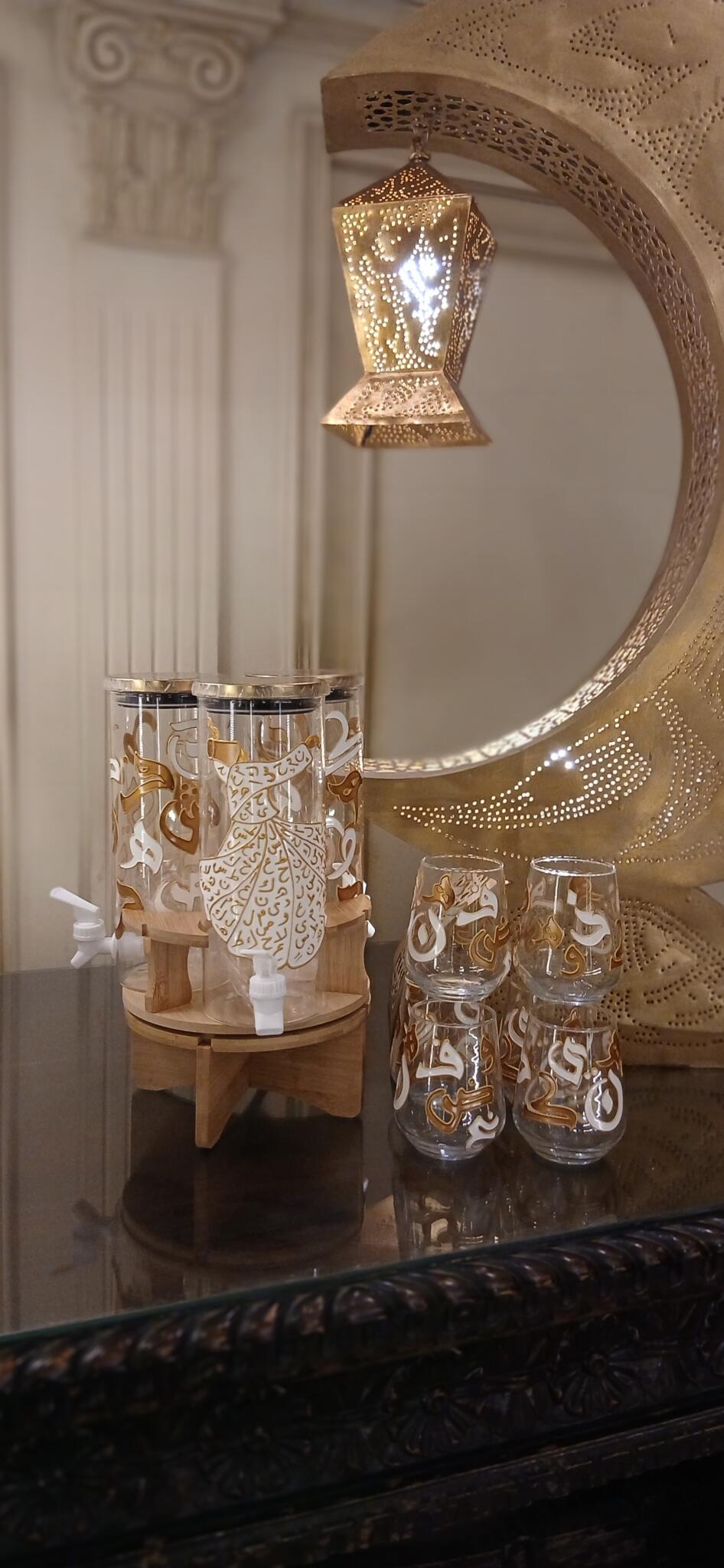 Hand painted calligraphy letters on juice cups and glass dispenser