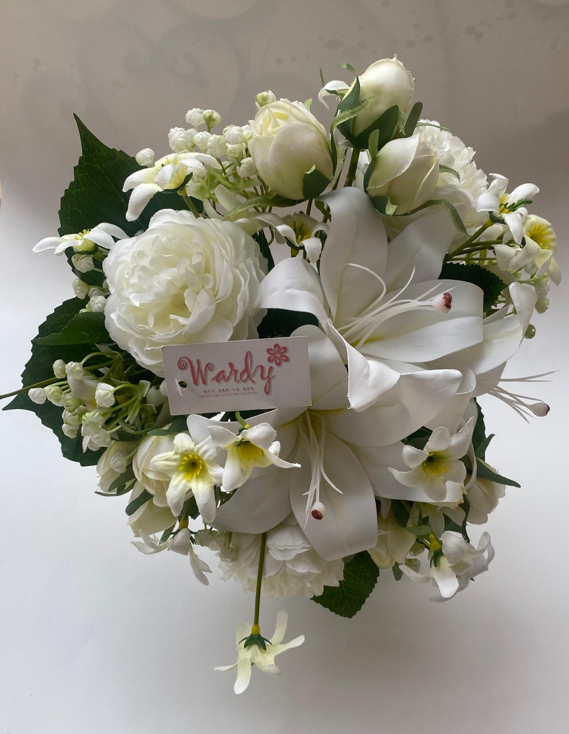 White Bridal bouquet in silk flowers.Round shape wedding bouquet.