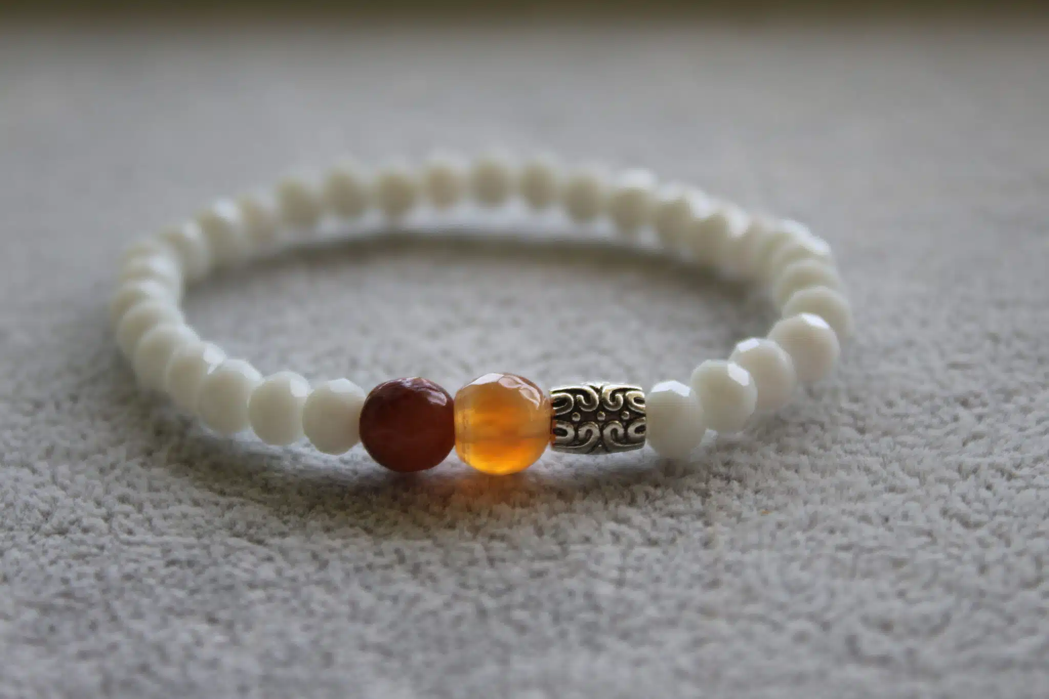 Elegant white bracelet mixed with artificial gemstones and silver spacebead.