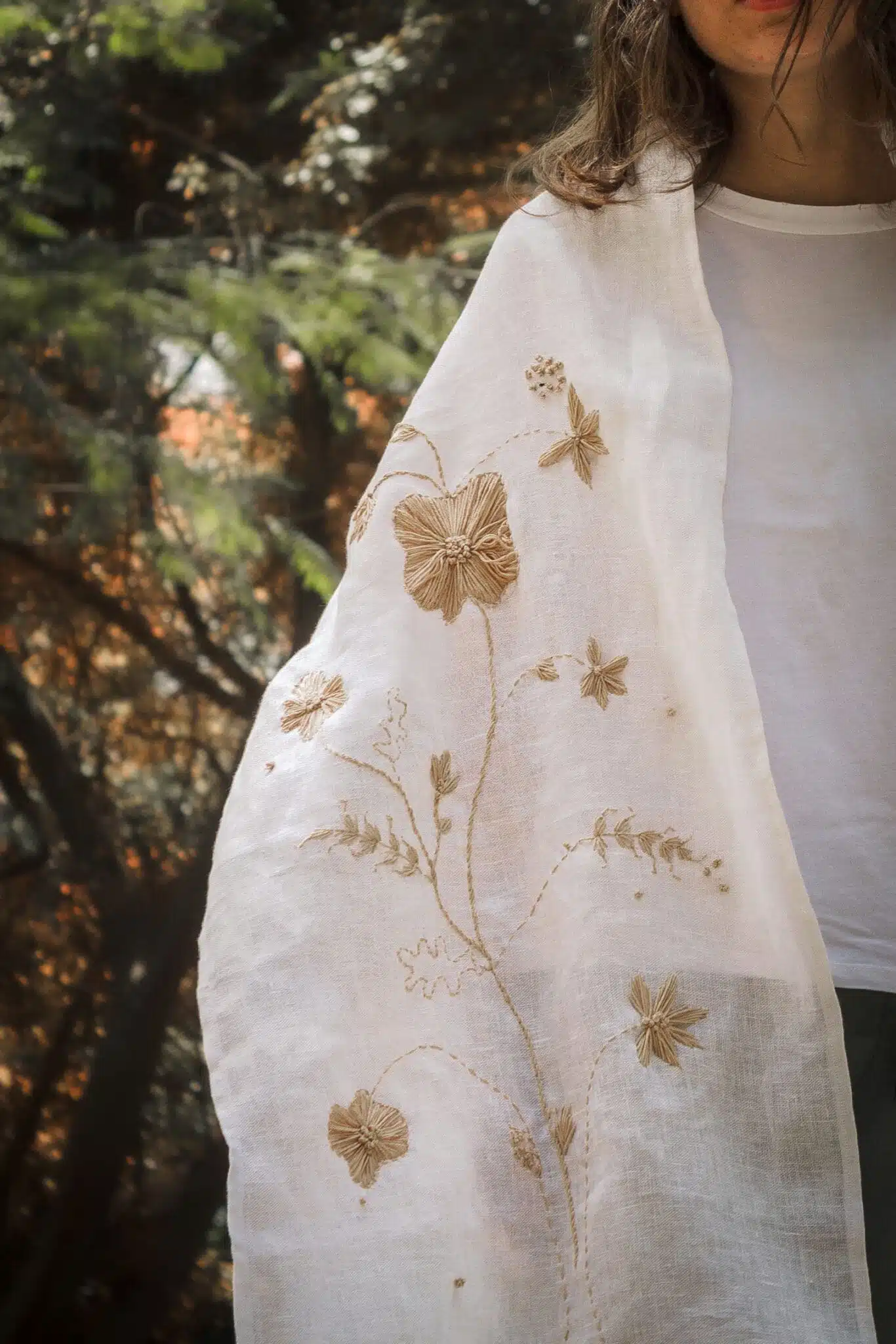 Pure linen shawl hand embroidered with gold color thread floral pattern.