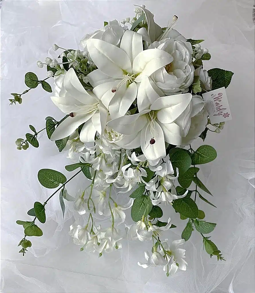 Bridal flowers.Semi cascade bridal design.White lilies in an elegant wedding bouquet.