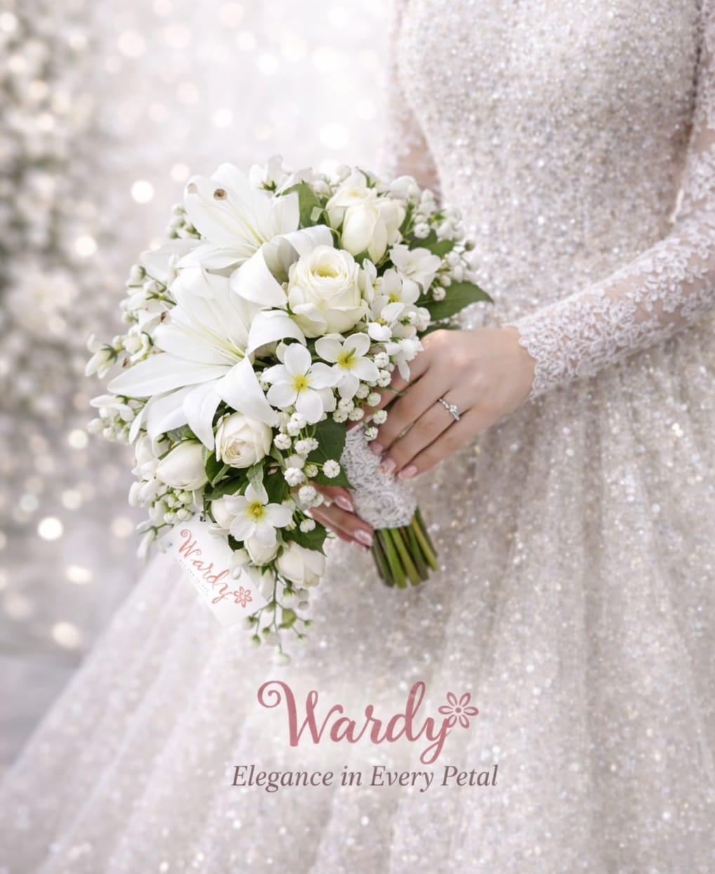 Bridal bouquet in a round shape.white lilies surrounded by rose buds and Jasmin touch.