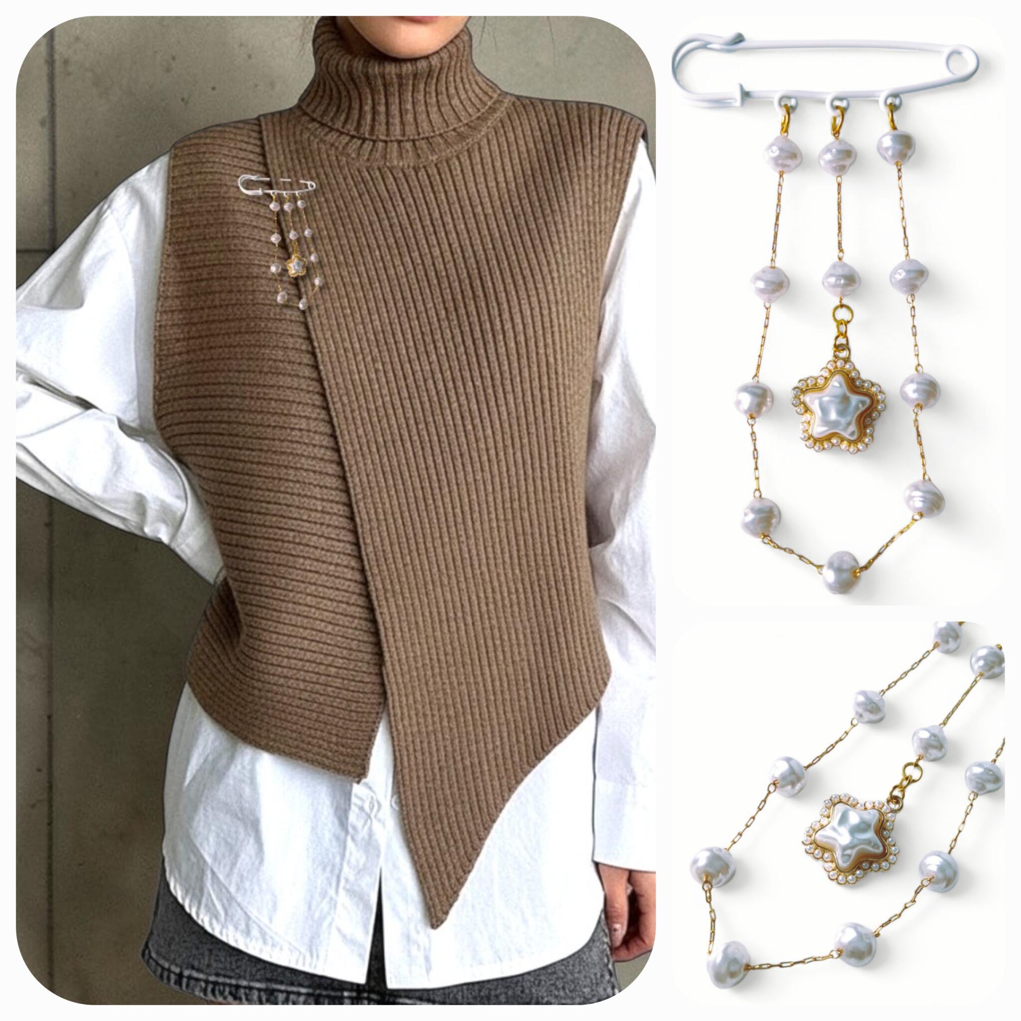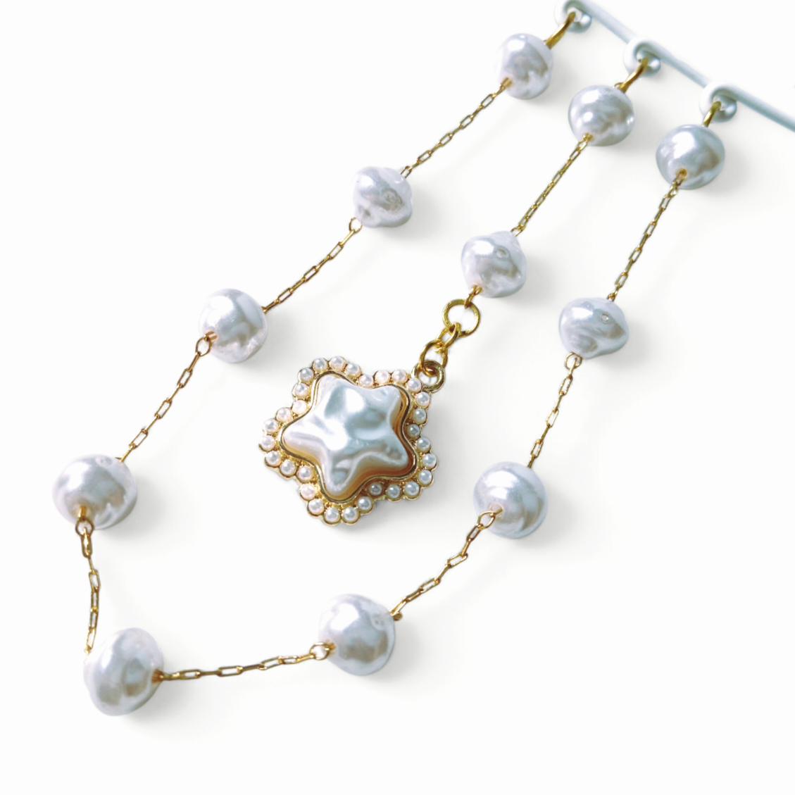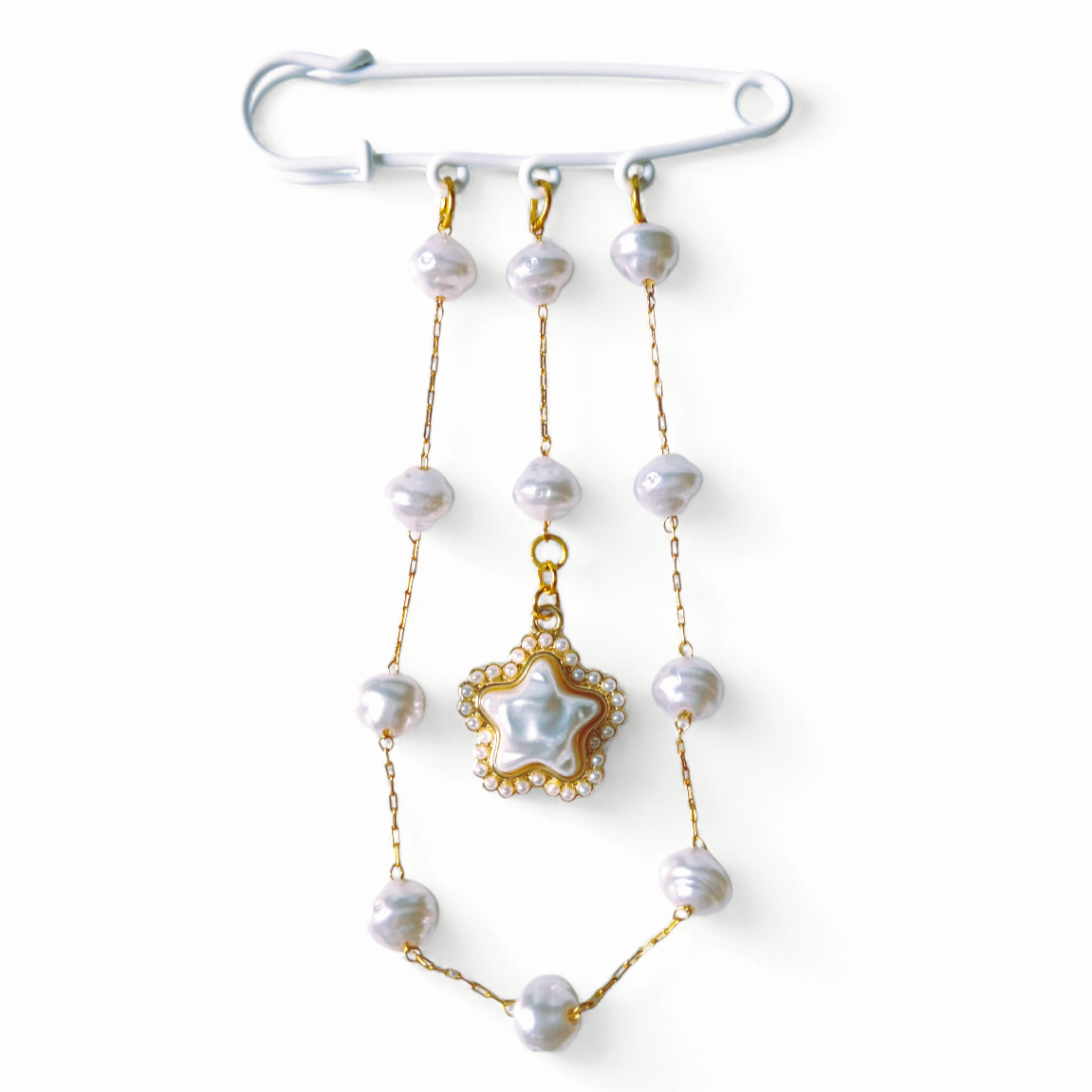 A pin made of white pearl stonr beads with 1 pendant made of pearls in the shape of a big star with tiny gold platted chains