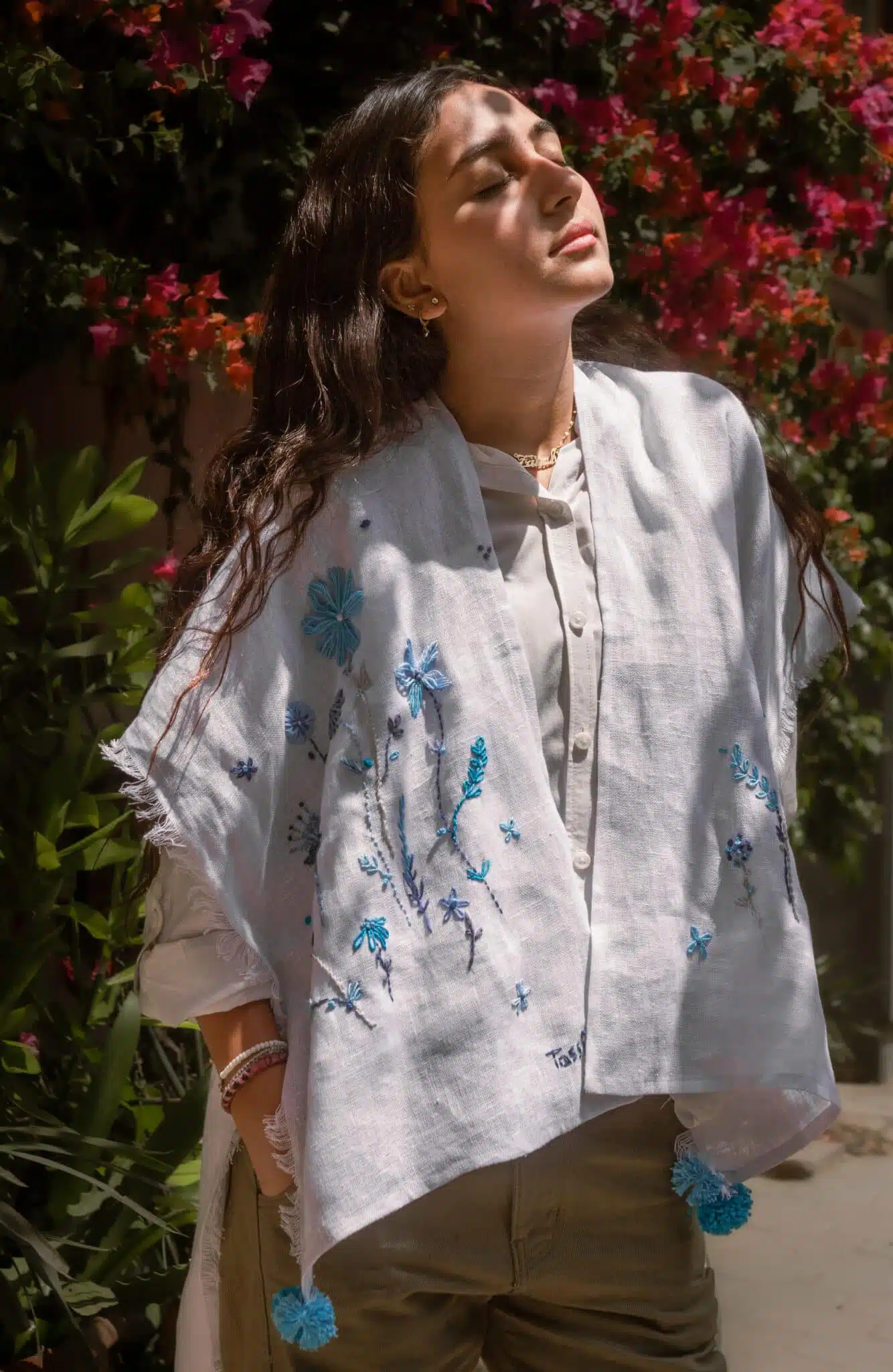 Pure linen poncho with handmade embroidery in blue shades flowers.