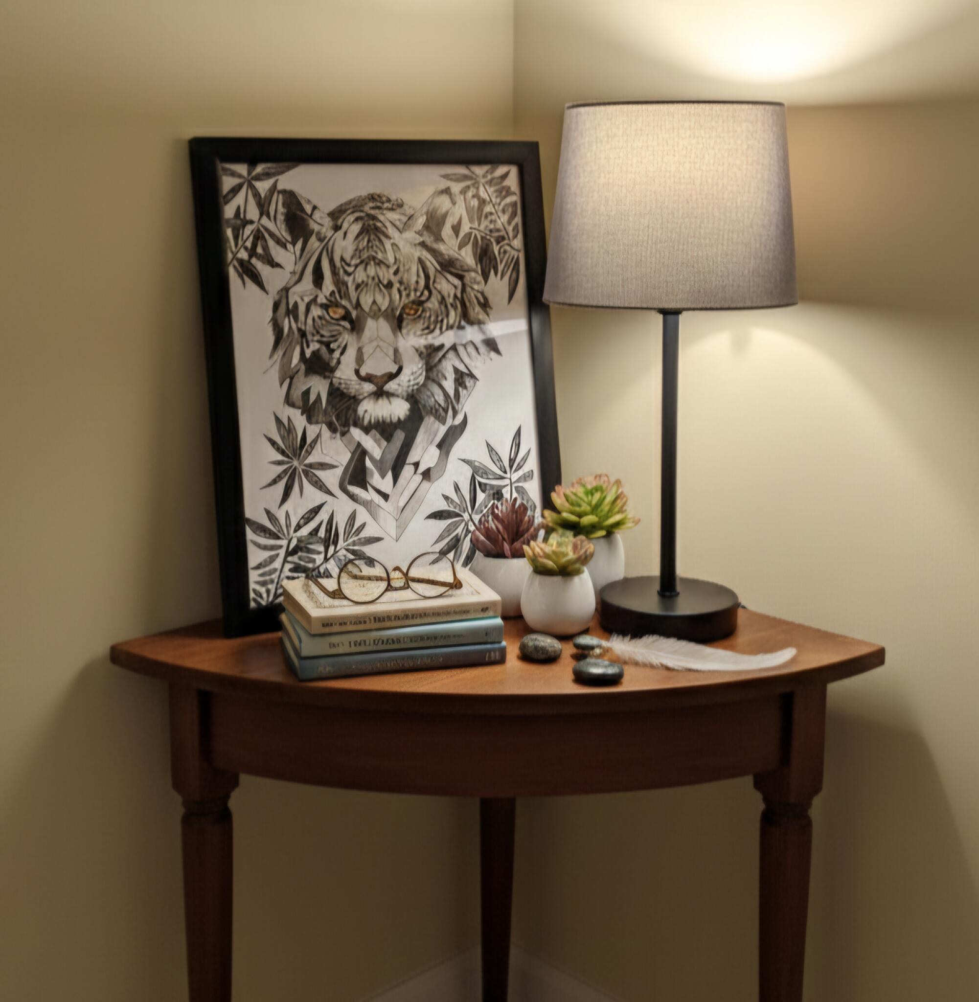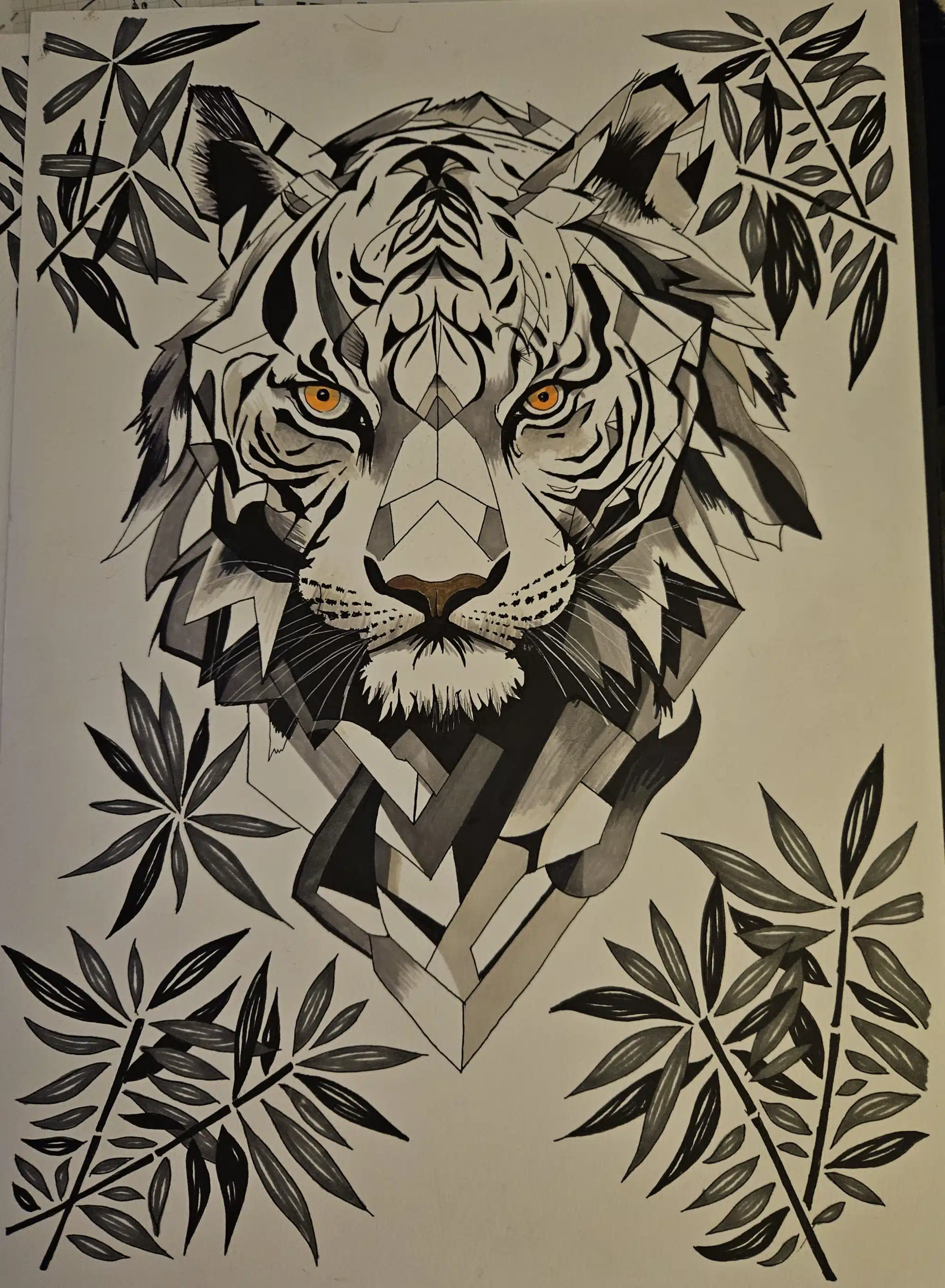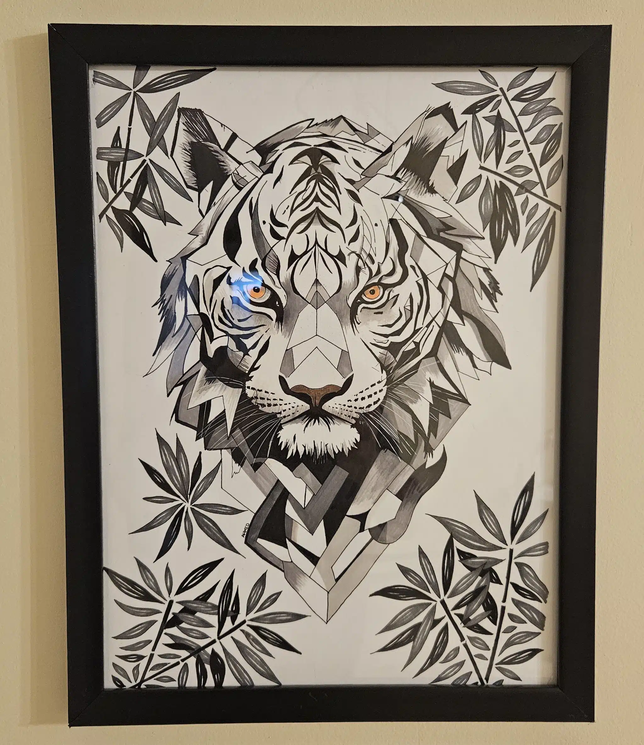 Unleash a powerful focal point in any room with Wild in Black and White. This striking artwork masterfully blends geometric precision with raw, untamed spirit, capturing a majestic tiger surrounded by stylized foliage. The high-contrast black and white palette provides dramatic sophistication, while the Tiger’s piercing golden eyes introduce an unexpected pop of fierce color and depth. Framed simply, this piece is the ultimate statement for those who appreciate detailed artistry and a bold, contemporary edge in their decor.