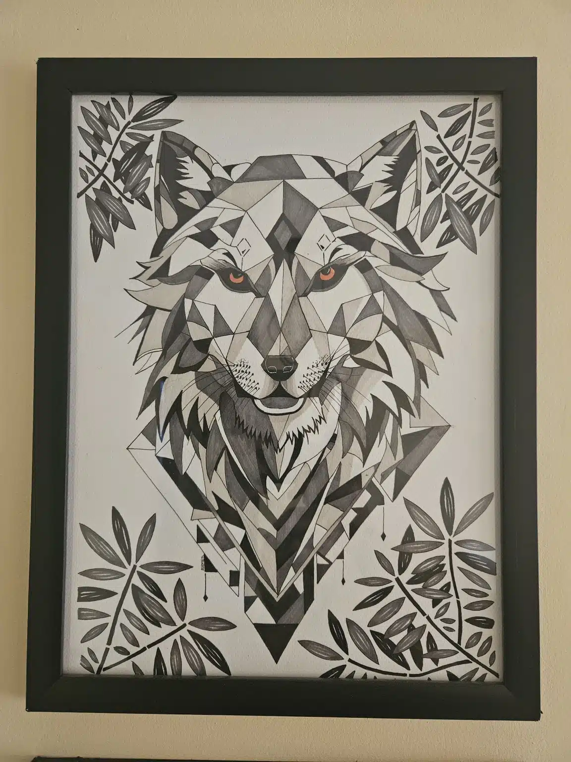 “Wild in Black and White” captures the mesmerizing intensity of nature with a sophisticated, contemporary edge. This stunning wolf portrait, rendered in rich shades of black, white, and grey, features intricate geometric patterns and feather detailing that give it a powerful, almost mystical presence. The wolf’s piercing golden-yellow eyes provide a vivid focal point, contrasting beautifully with the monochromatic palette. Framed by organic foliage, this piece is perfect for those seeking art that is both boldly decorative and deeply evocative of the wild spirit