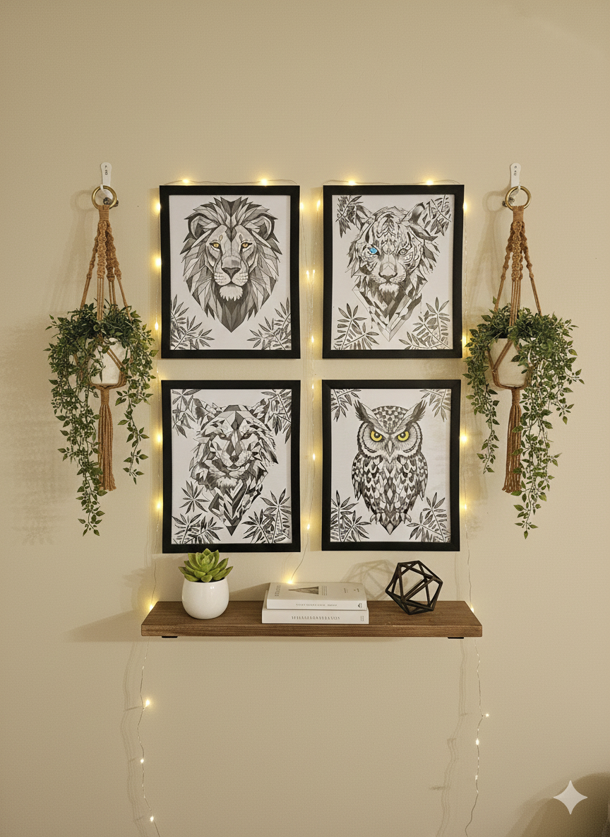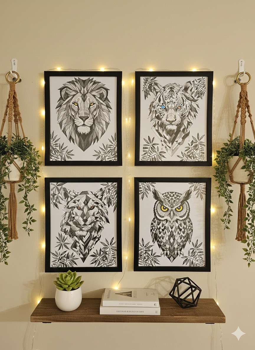 Wild in black and white set of 4 paintings available in black wooden and glass frames 30 × 40 cm each A3 size.