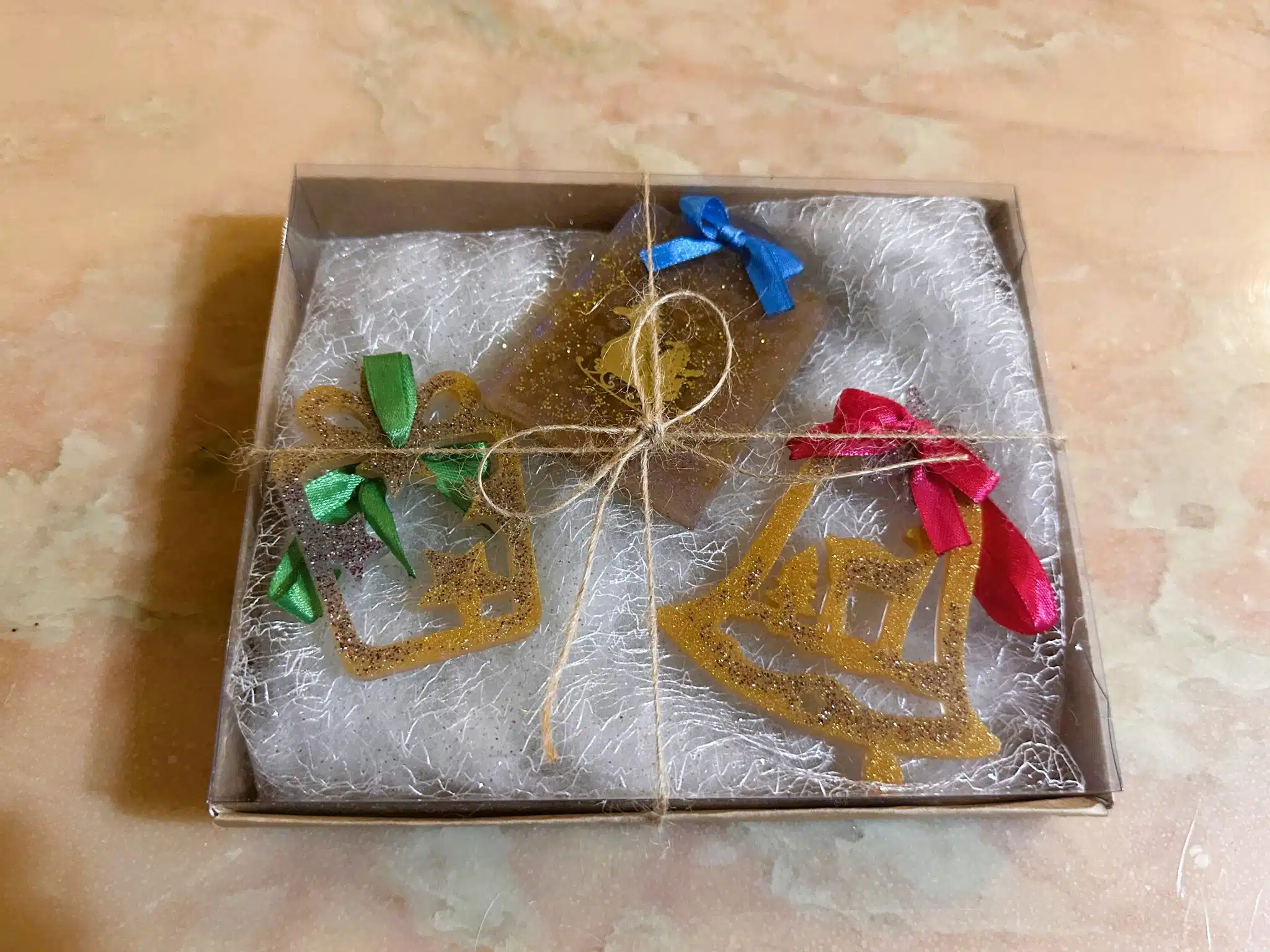 This is a set of 3 different Christmas tree ornaments. One bell shape, one gift shape and another rectengular shape with a Santa Claus sticker. Their color is a mixture of gole and beige-grey with glitter and colored ribbons.