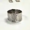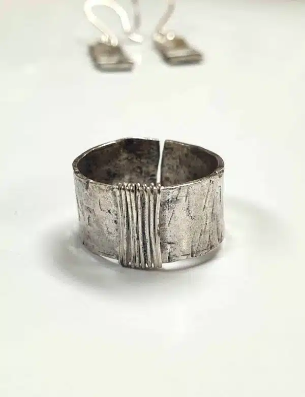 Textured sterling silver ring with wire wrapping in the middle.