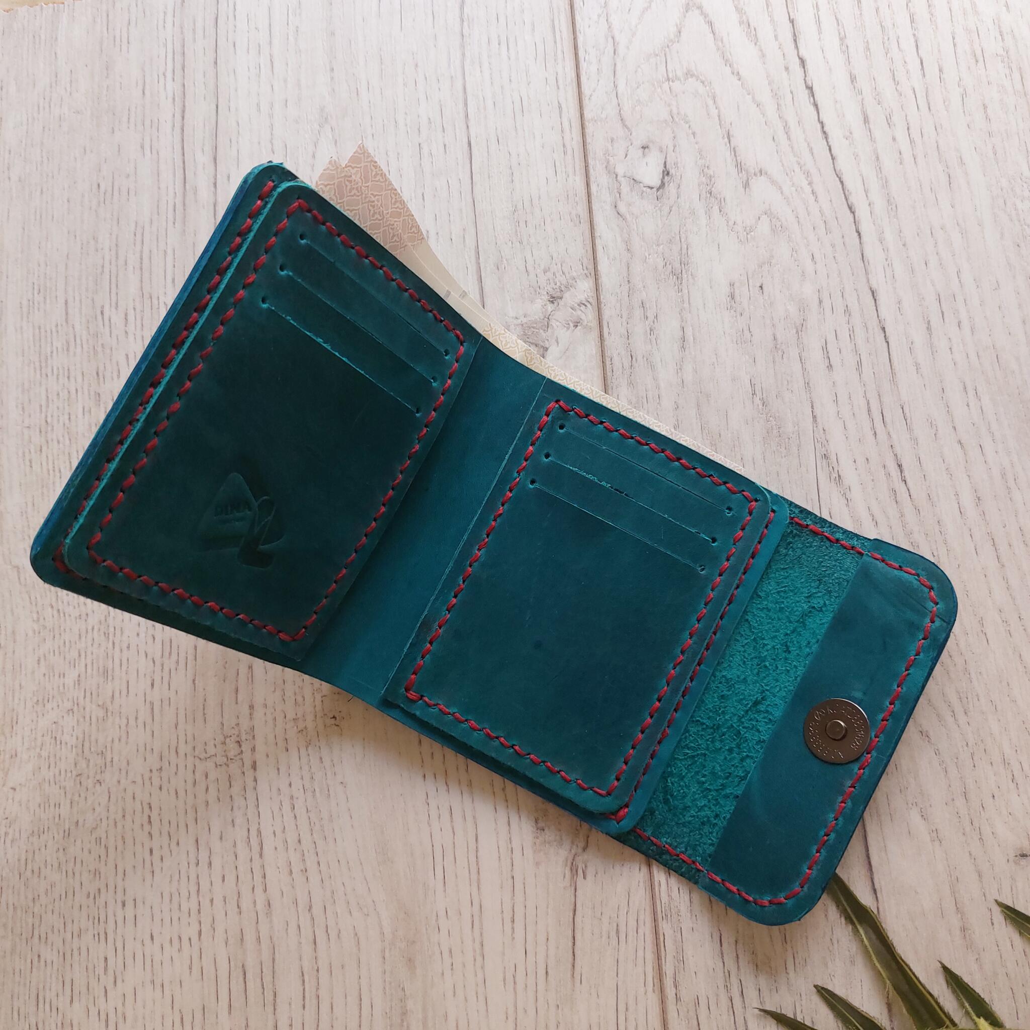 محفظة حريمى صغيرة جلد طبيعى هاند ميد لون فيروزى عليها رسمة بالون احمر