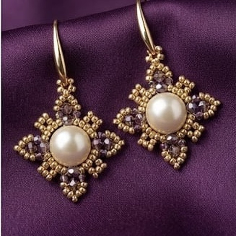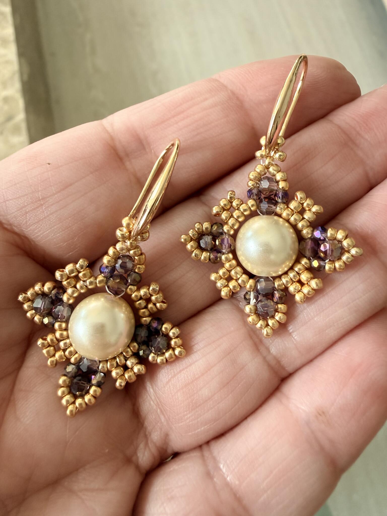 Radiating timeless elegance, these handcrafted earrings feature a luminous pearl center framed by intricate gold Miyuki Delica beads and faceted crystal accents. Lightweight and refined, they offer a luxurious statement with every movement.