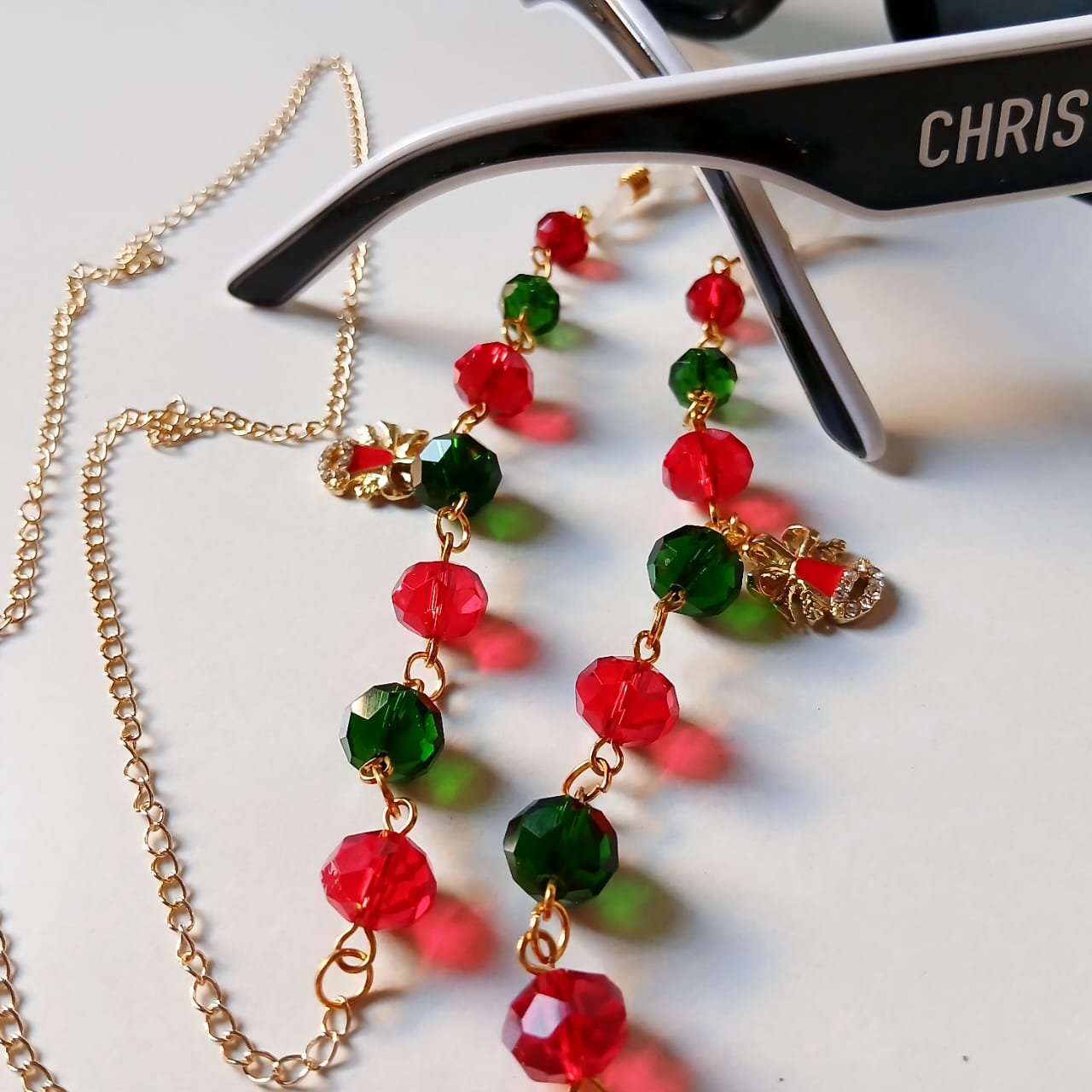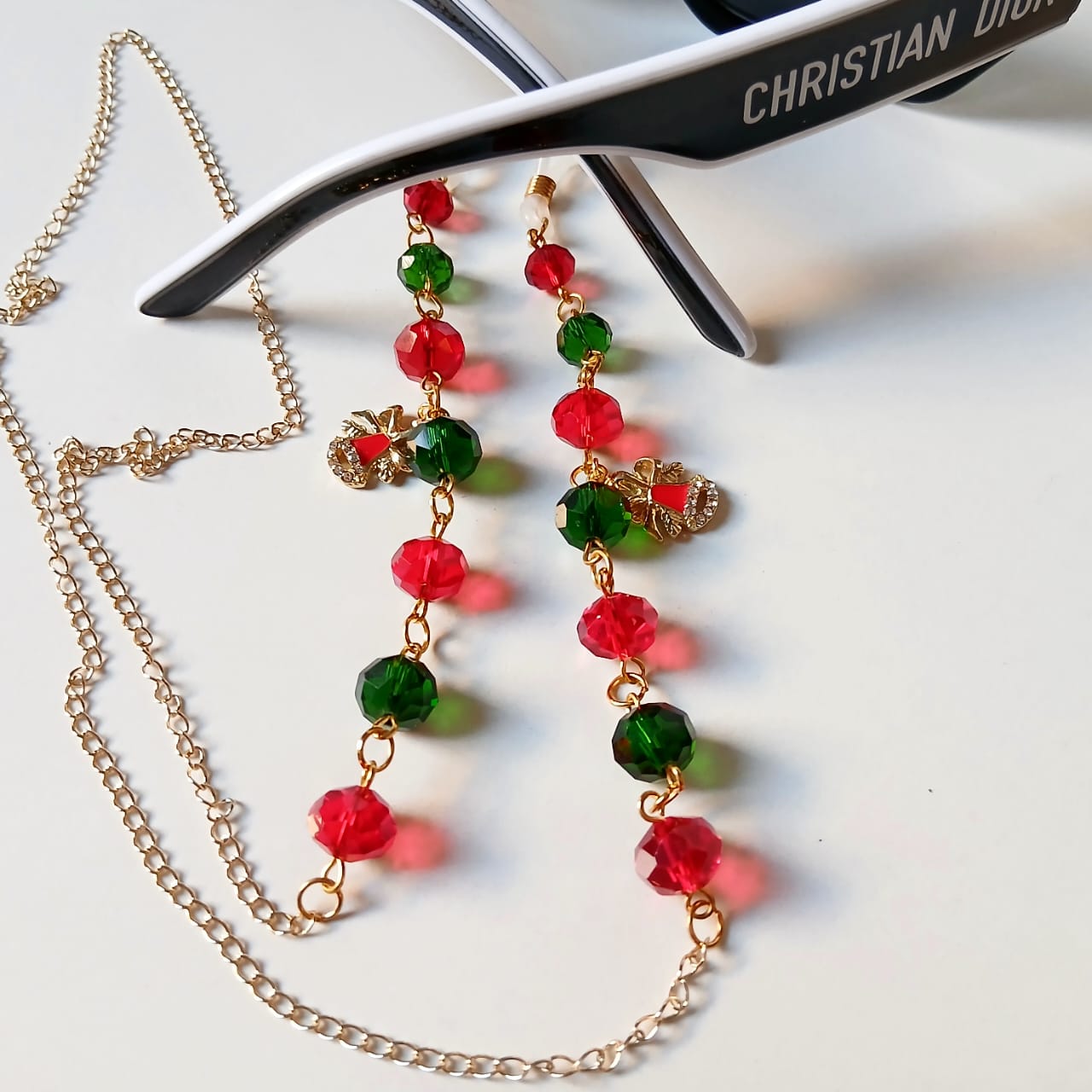 Glasses chain made of red and green crystal stone beads with 2 bells pendants