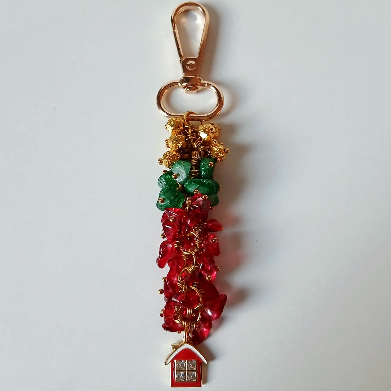 Bag charm made of red and green chip beads and golden Lava beads with a red pendant in shape of Xmas home