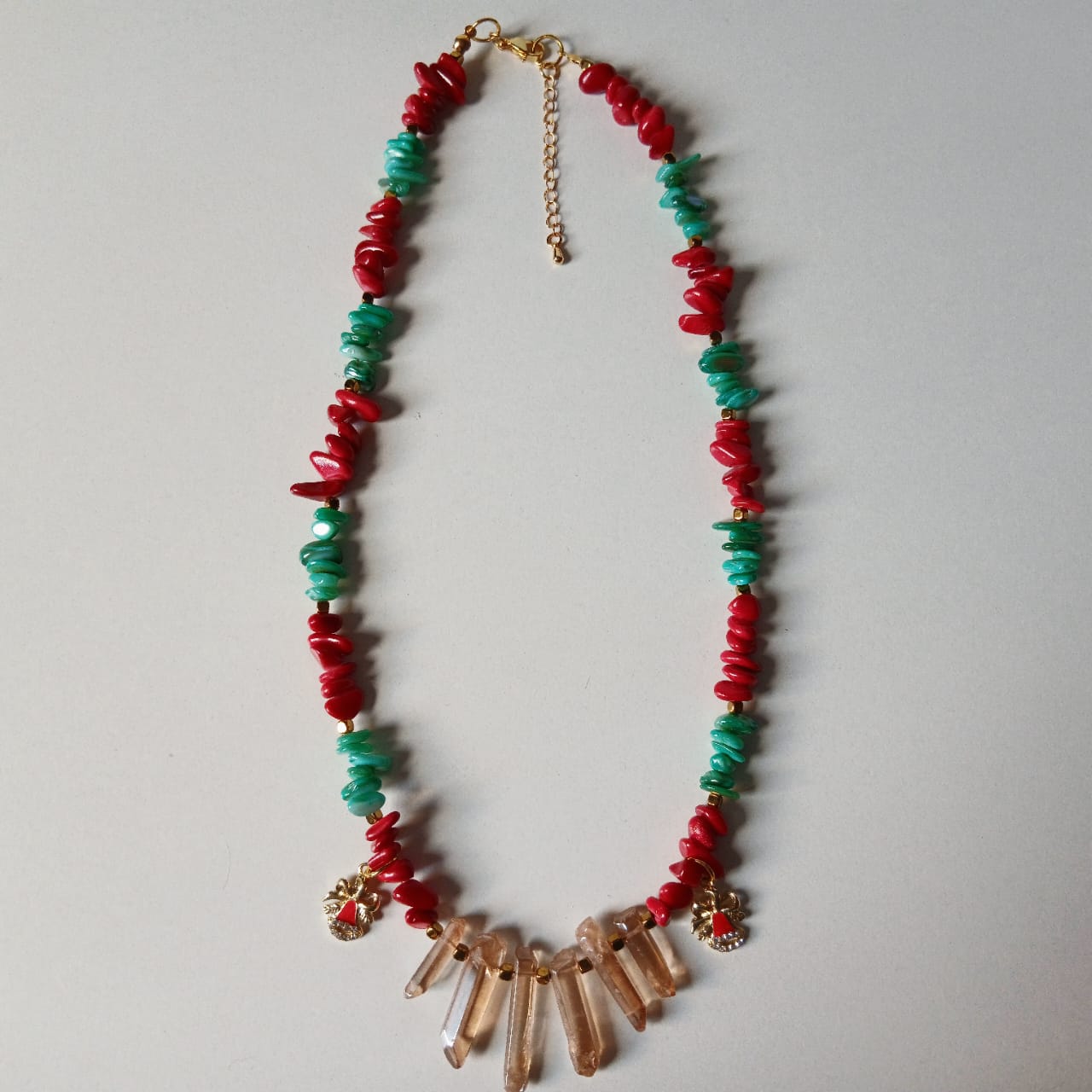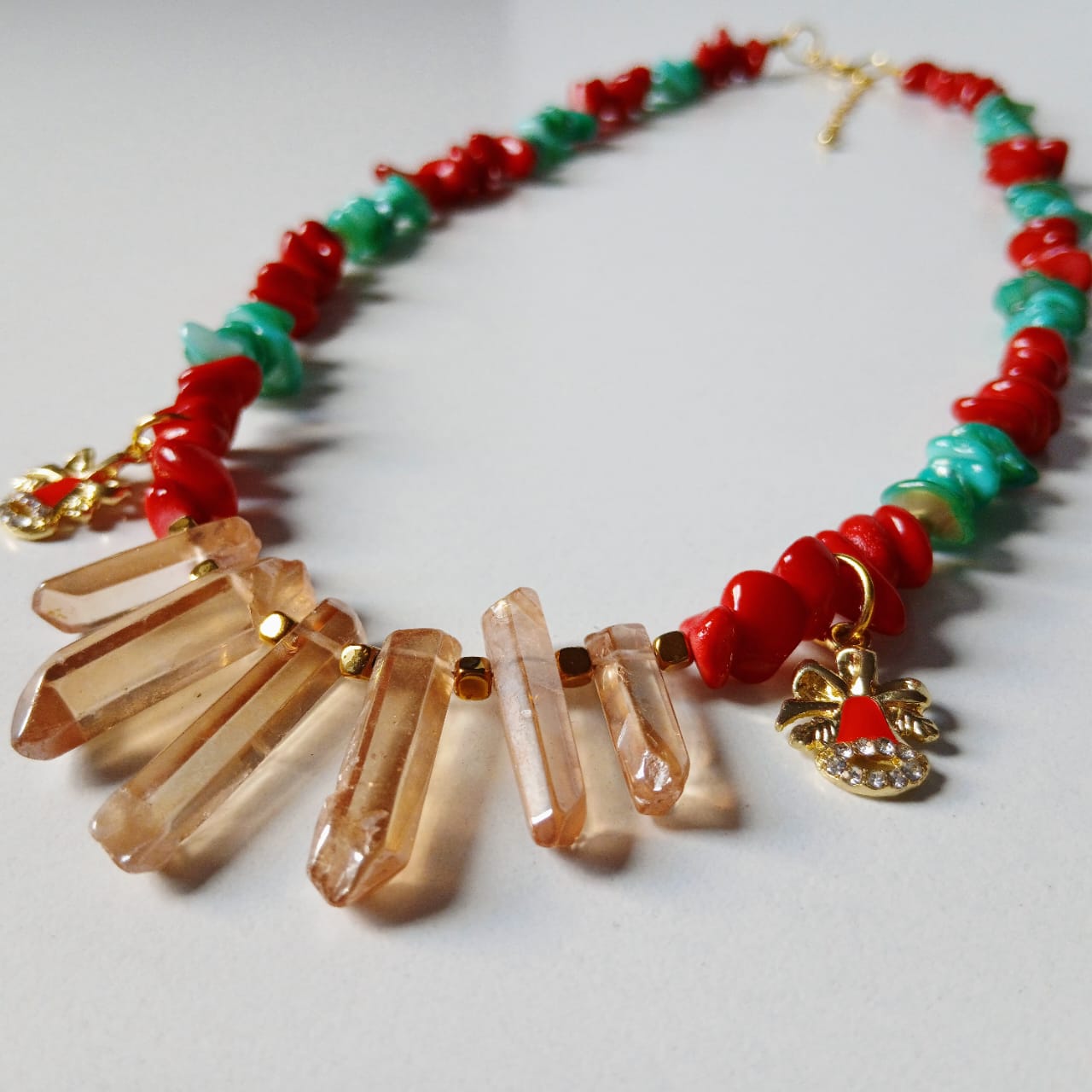 A Xmas theme necklace made of green | red chip beads stones along with golden agate stones and 2 pendants in the shape of the bell