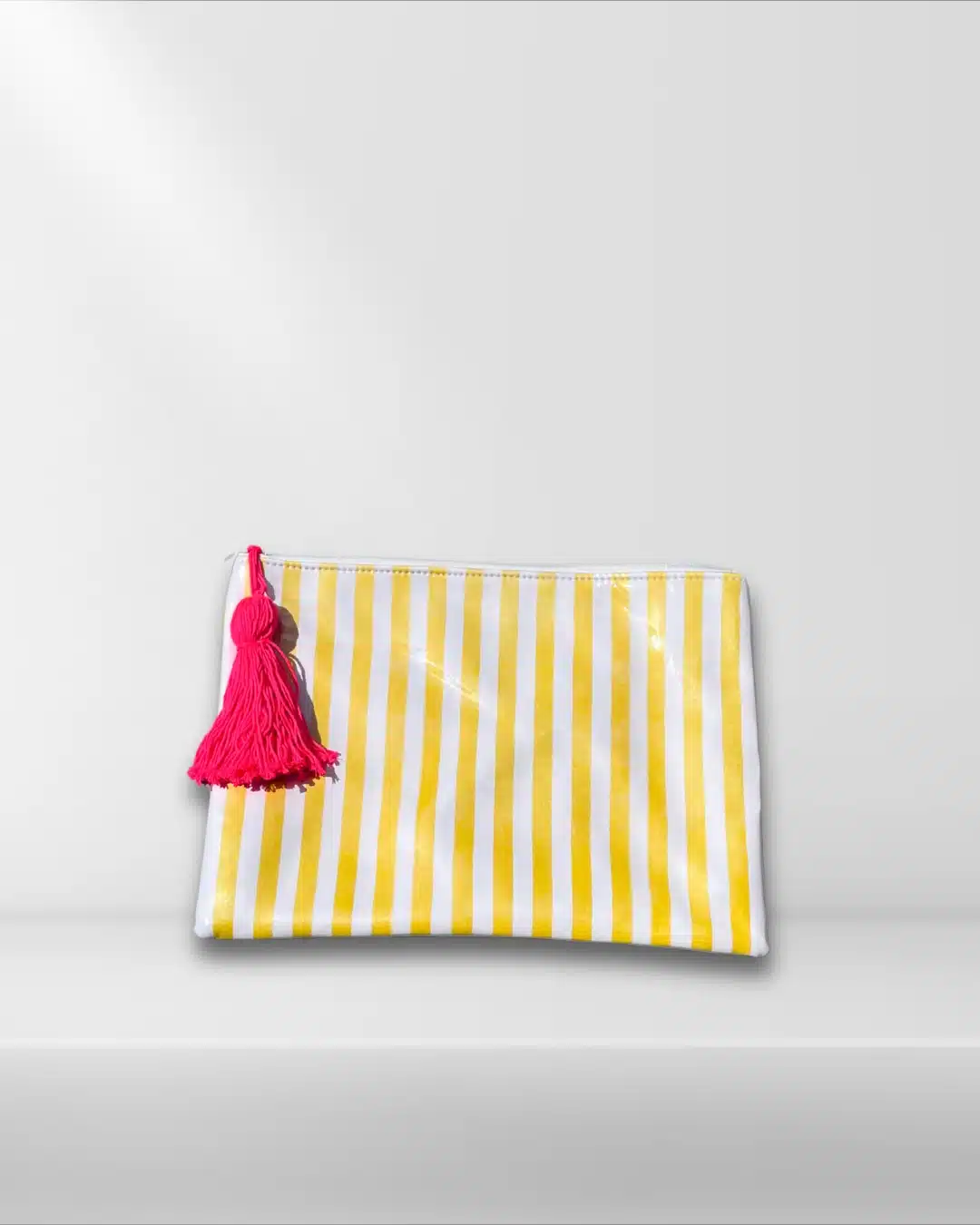 Plastic Wrapped Pouch size 25x35cm , in yellow & white  striped pattern with fuschia tassel,
