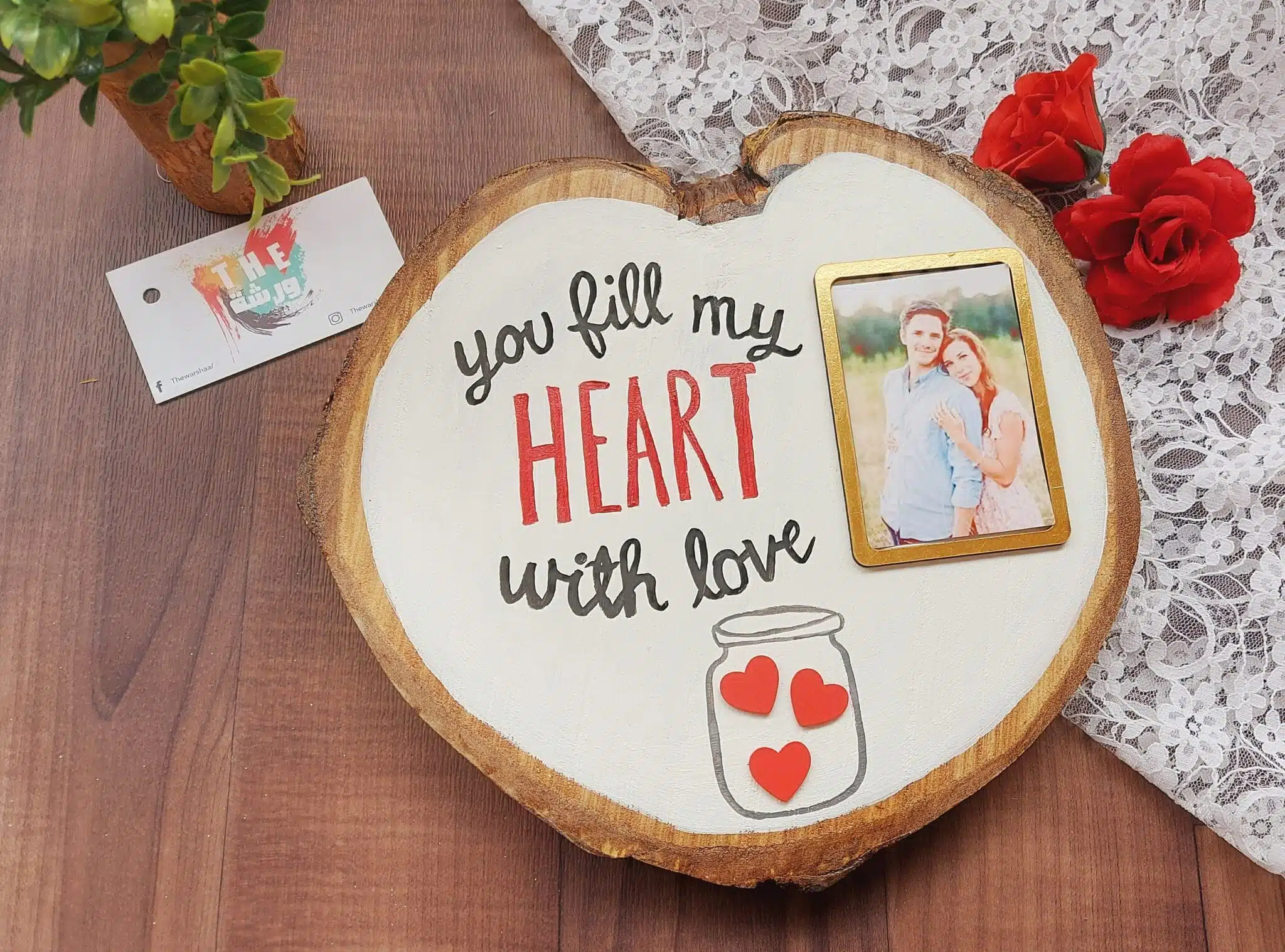Handmade wood slice with 3D photo frame and 3D hearts at the bottom, to gift your loved ones