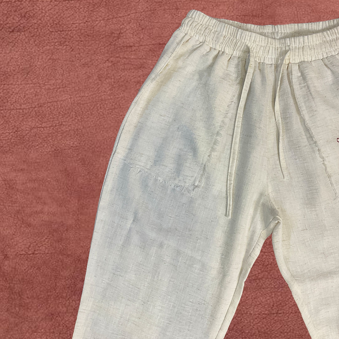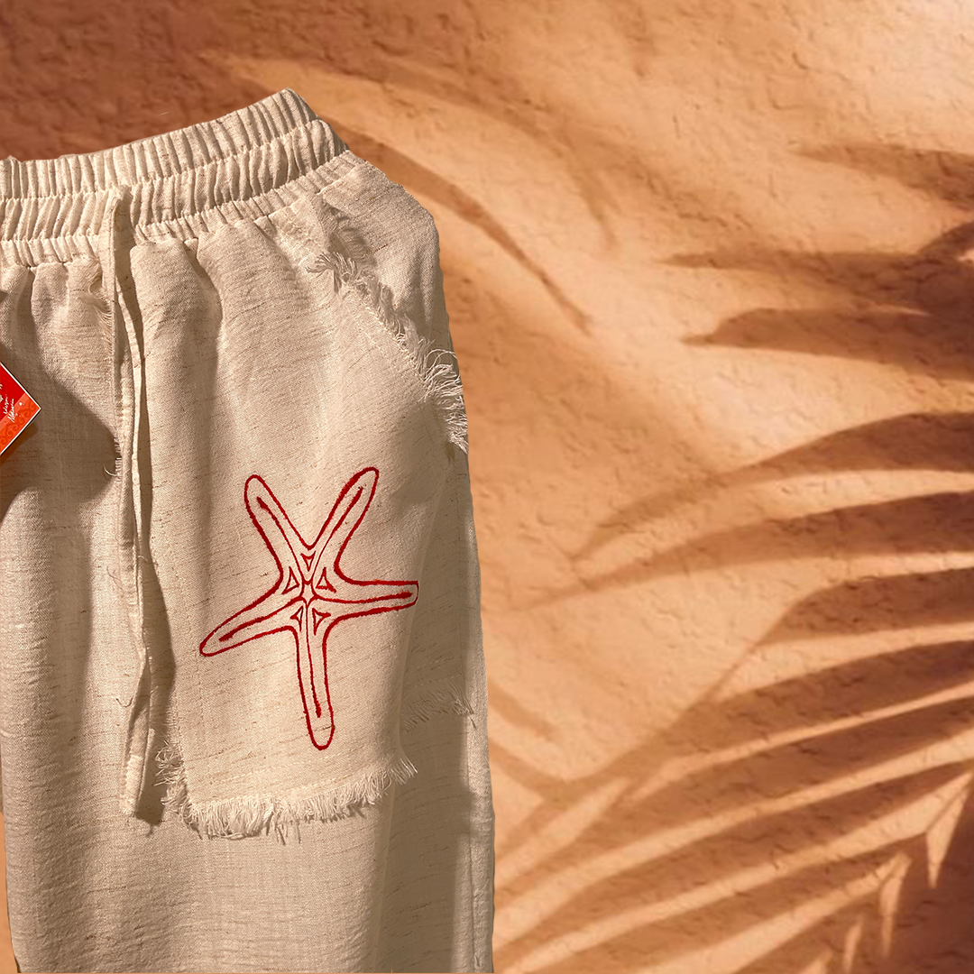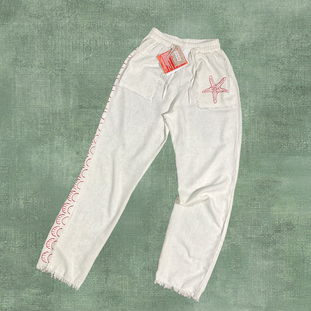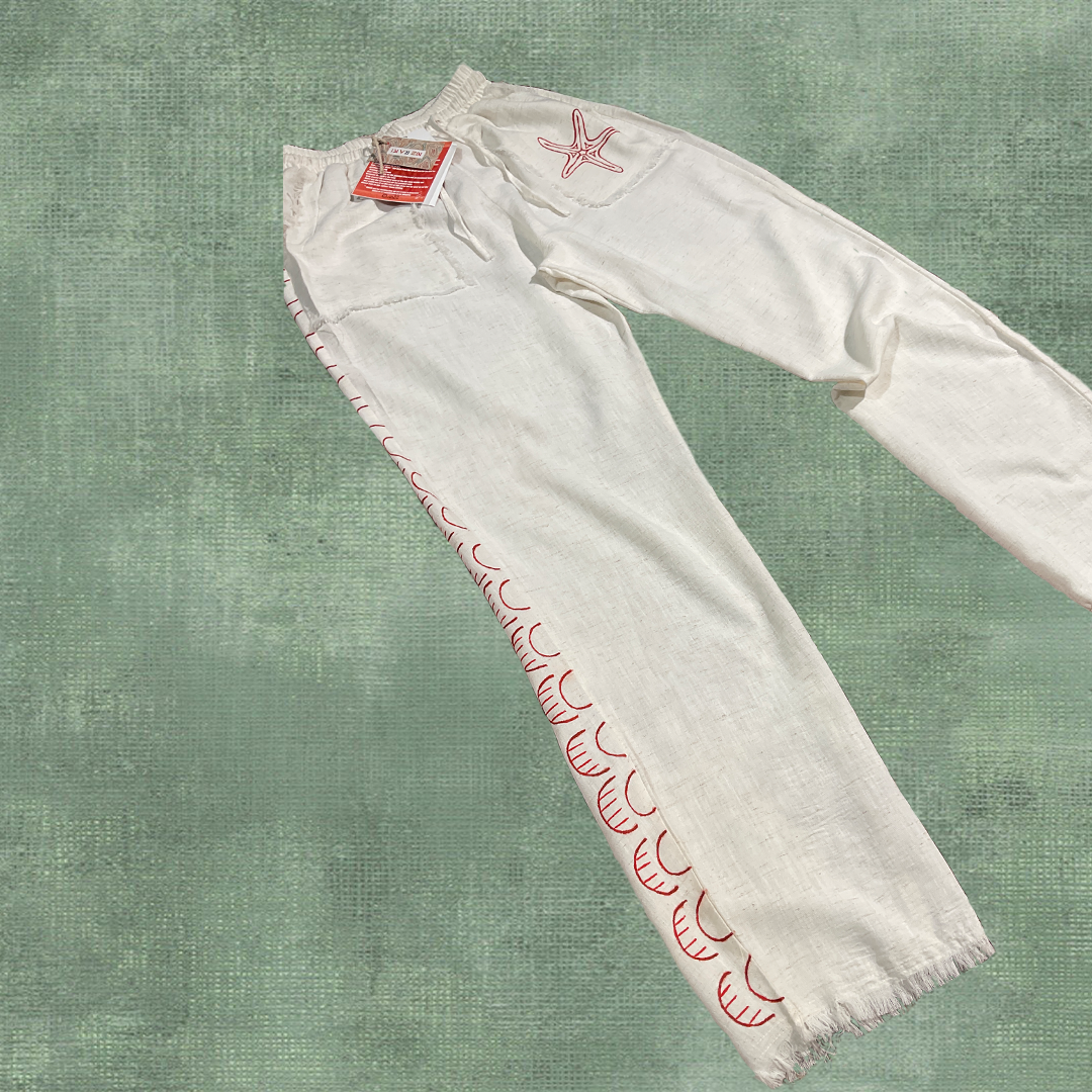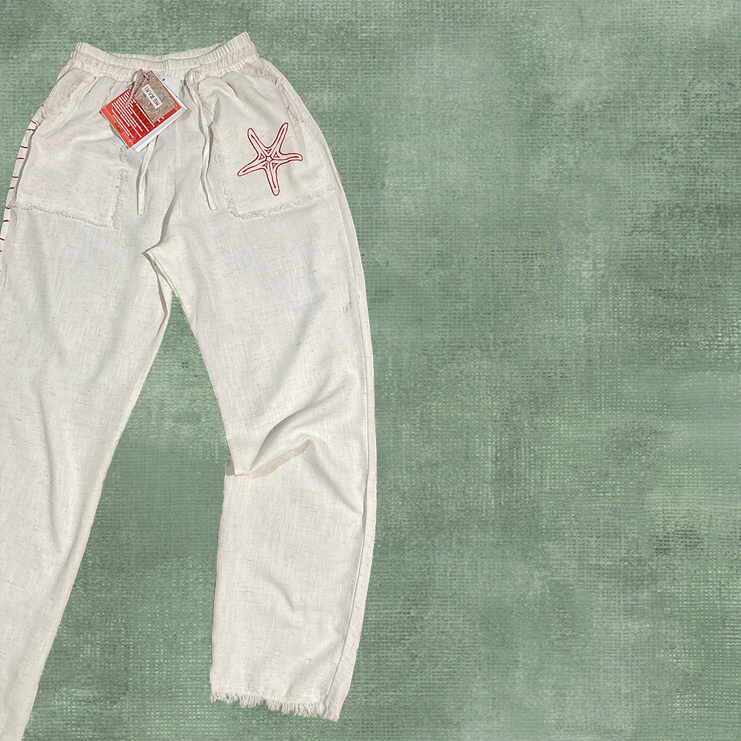 Relaxed-fit textured natural African linen pants, hand-painted with marine-inspired motifs — each brushstroke adds a unique artistic touch with raw unfinished edges. Soft, breathable, and perfect for effortless summer style.