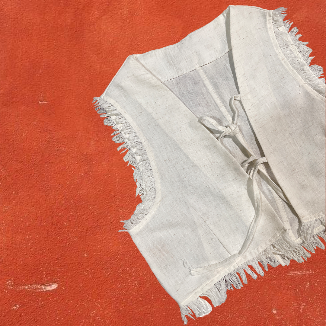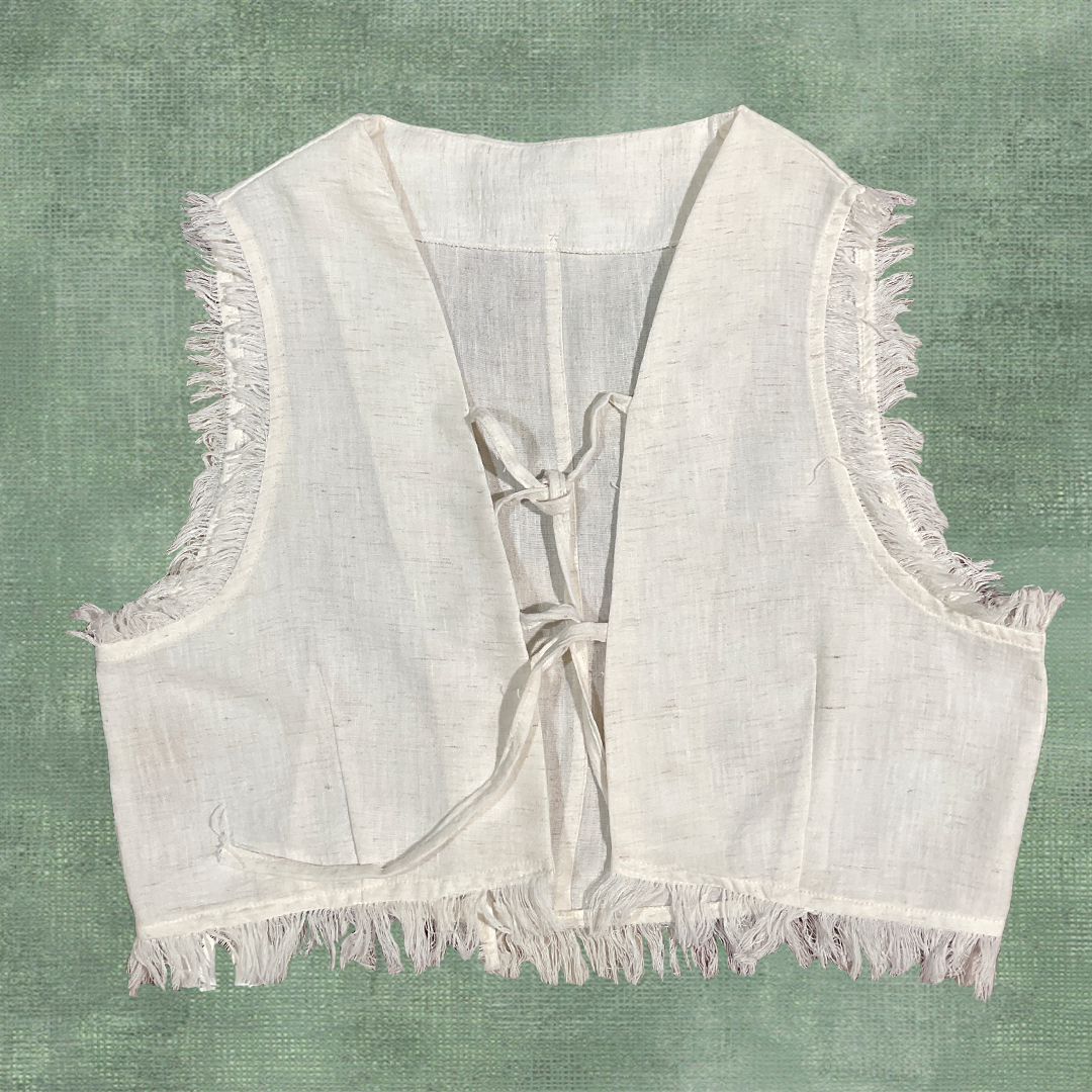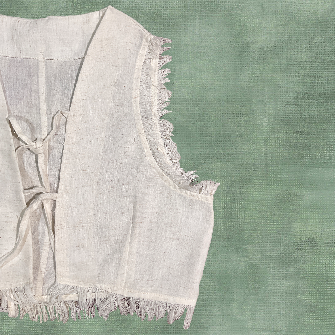 Basic linen vest crafted from natural African linen with raw fringed unfinished details and two front tie closure — timeless and effortlessly chic.